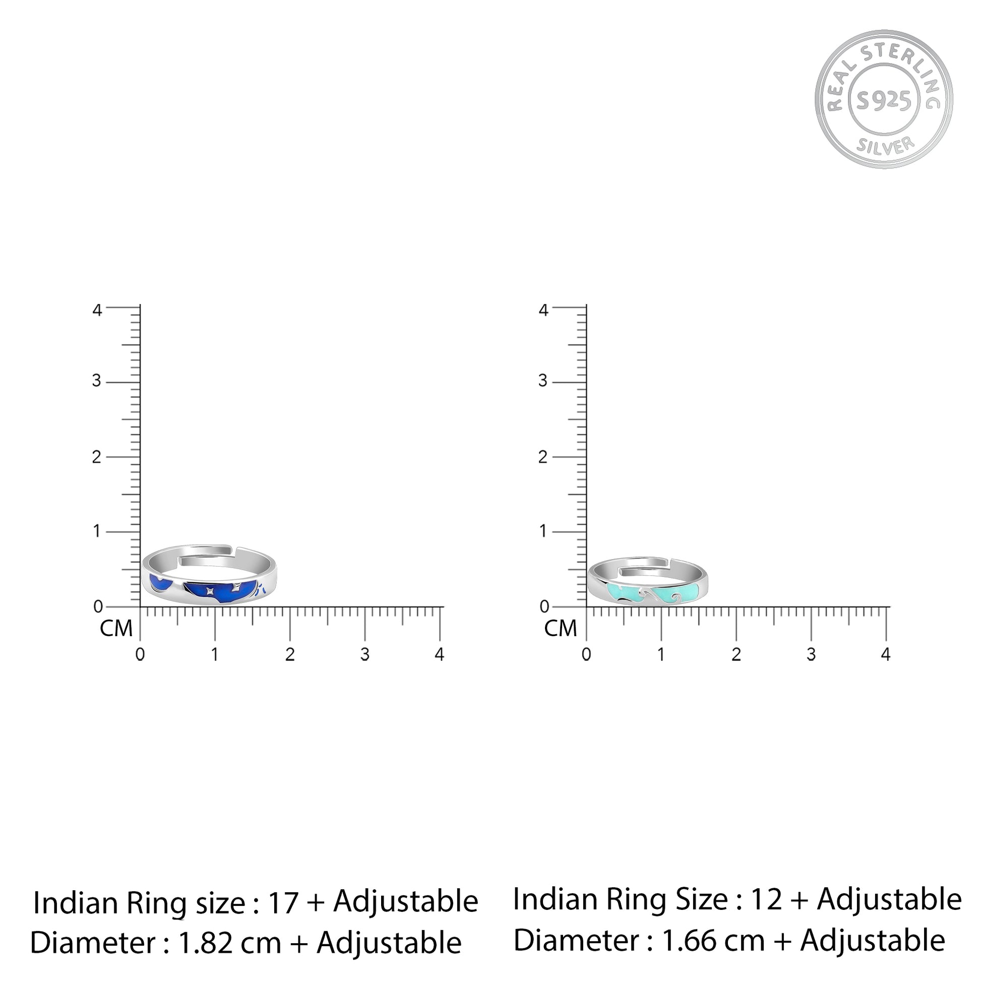 These silver couple rings have an adjustable band featuring abstract designs filled with coloured enamel.