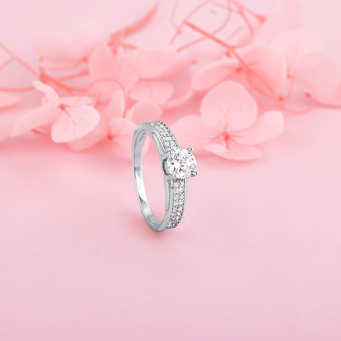 This silver vintage-designed ring features a zircon in the centre of a band set with zircons in two rows.