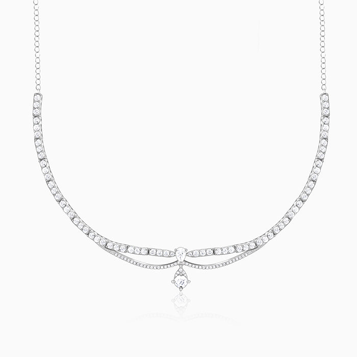 This silver necklace for women features a graceful, U-shaped top row of channel-set rectangular zircons, with two curving rows of smaller zircons beneath it. A captivating pear-shaped zircon drop forms the centrepiece, completing its classic design. Presenting our DIVA Collection - a limited edition silver jewellery meant for the women who own every room. Be the star of the party, always.