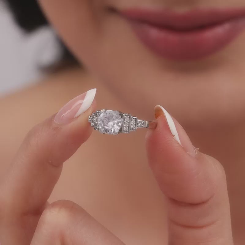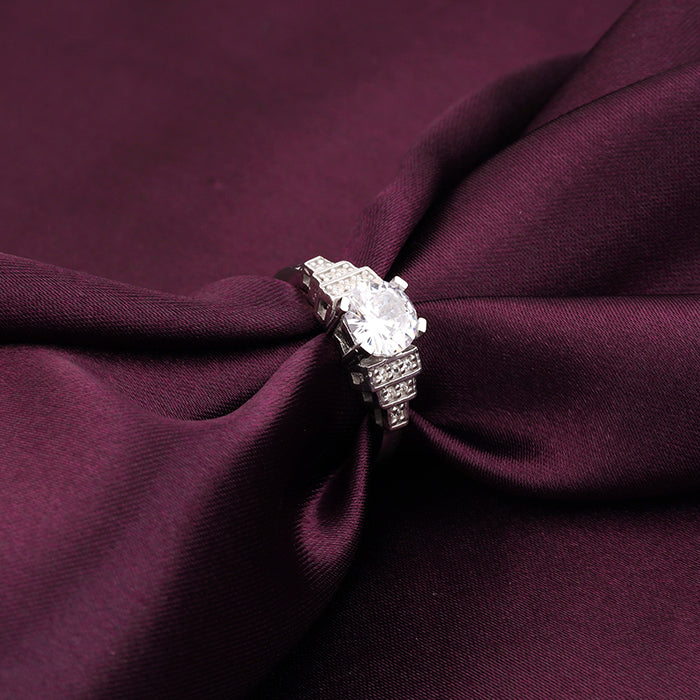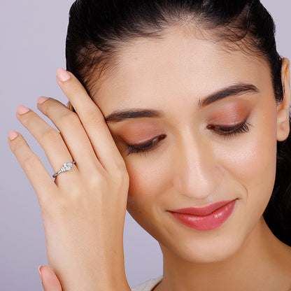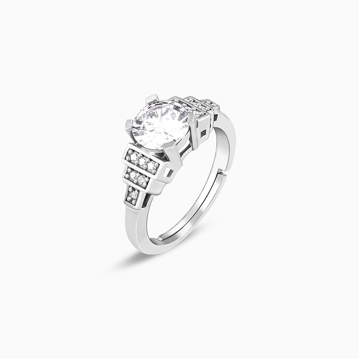 This silver ring has a gorgeous design with a zircon placed at the centre flanked by zircon bars.