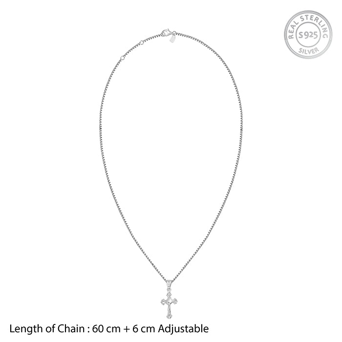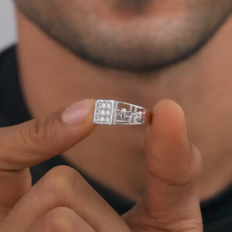 This silver set for men includes a pendant with a box chain and a ring. The pendant features a cross charm with a striped textured pattern, adding a bold and modern touch. The ring showcases a square design set with zircons, while the shank features a distinctive cut-out pattern for added detail.