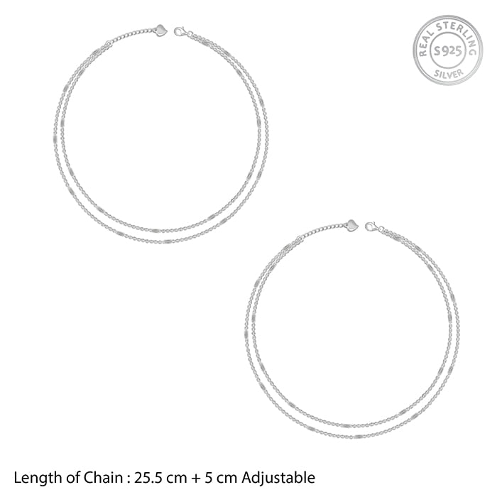 This silver anklet features dual chain design with cylindrical motifs.