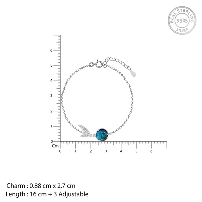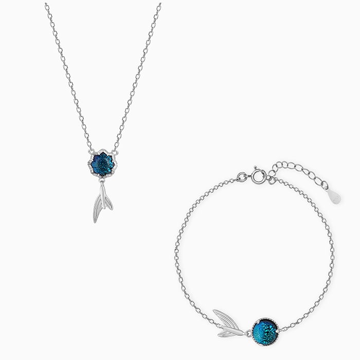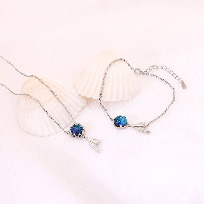 The silver set has a bracelet and a pendant with the beautiful blue-coloured stone placed on a round structure with a fishtail following the stone.