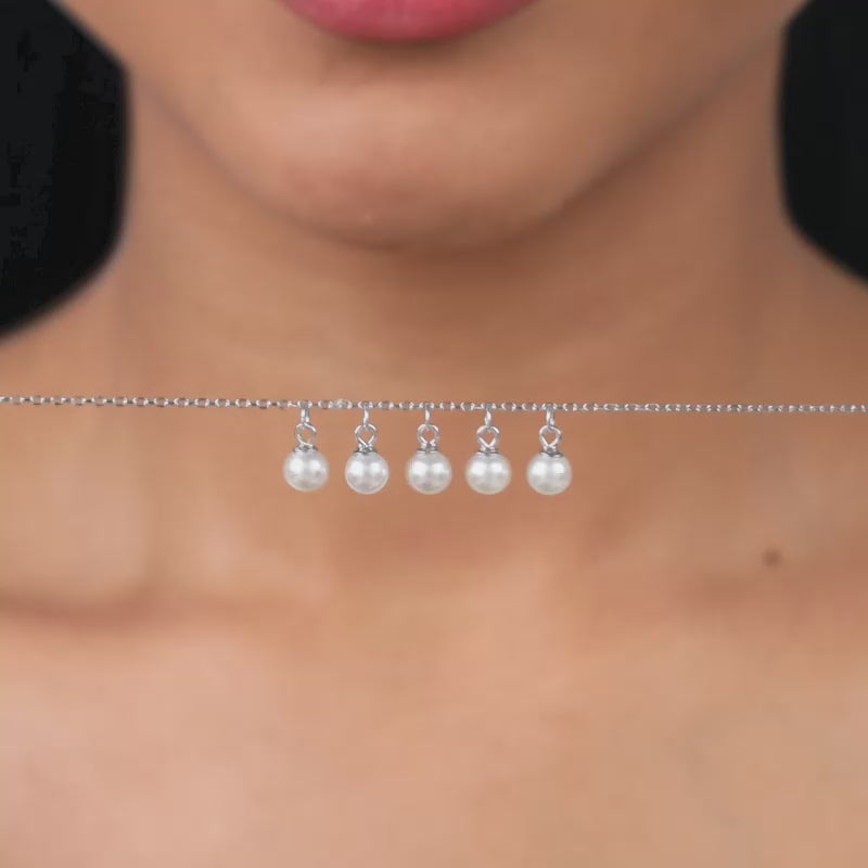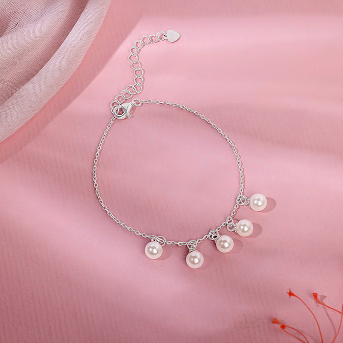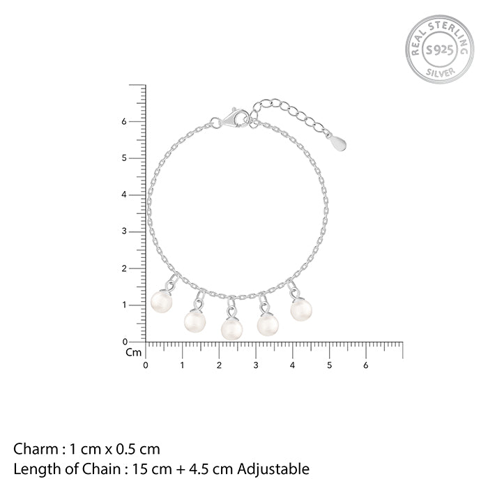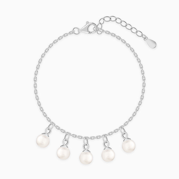 This silver bracelet for women has five circular pearls dangling in the centre.