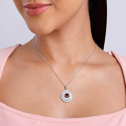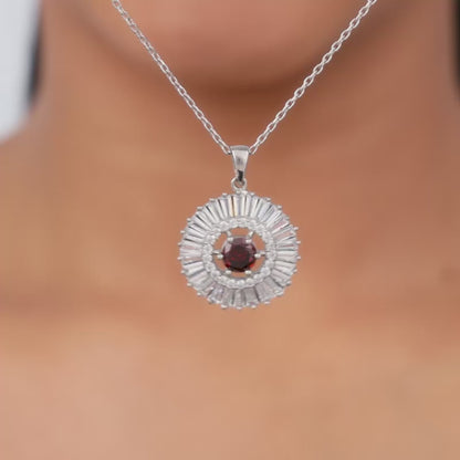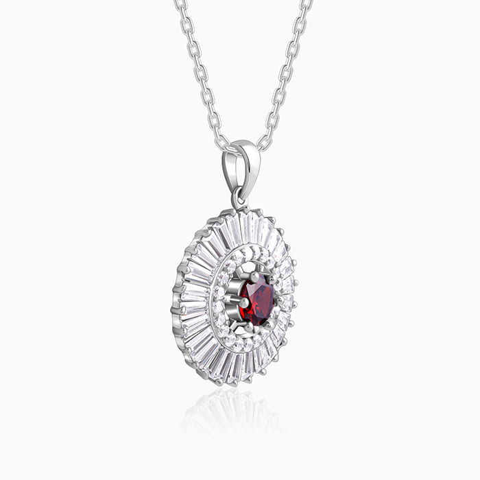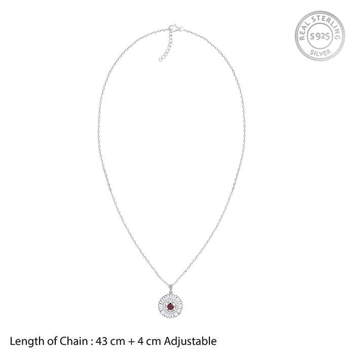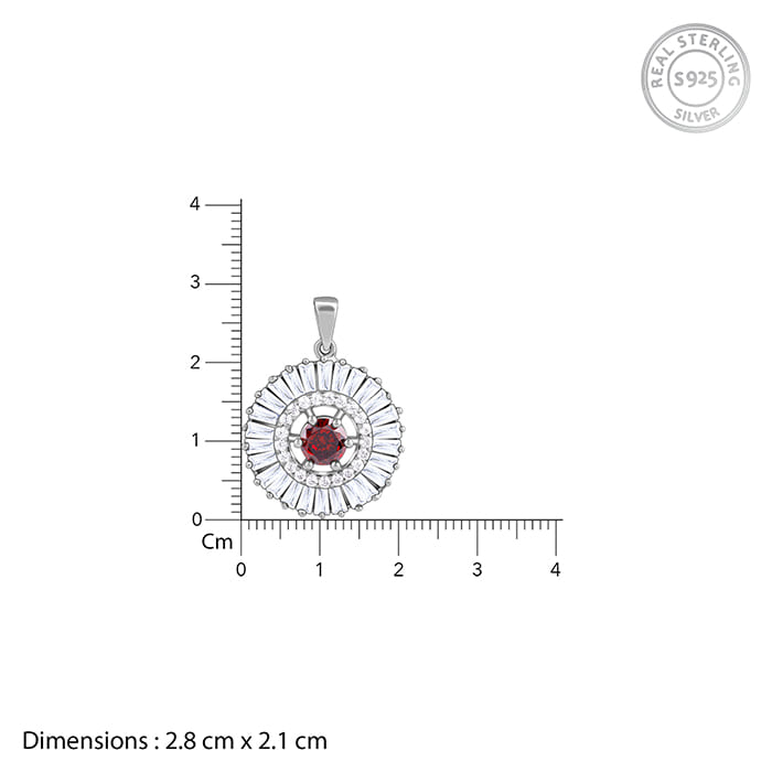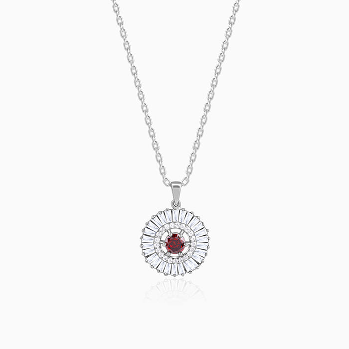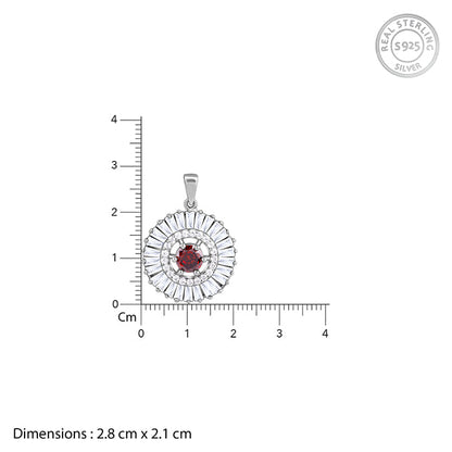 This silver pendant with link chain for women features a striking round red coloured stone at its centre. It is surrounded by a halo of closely set zircons.