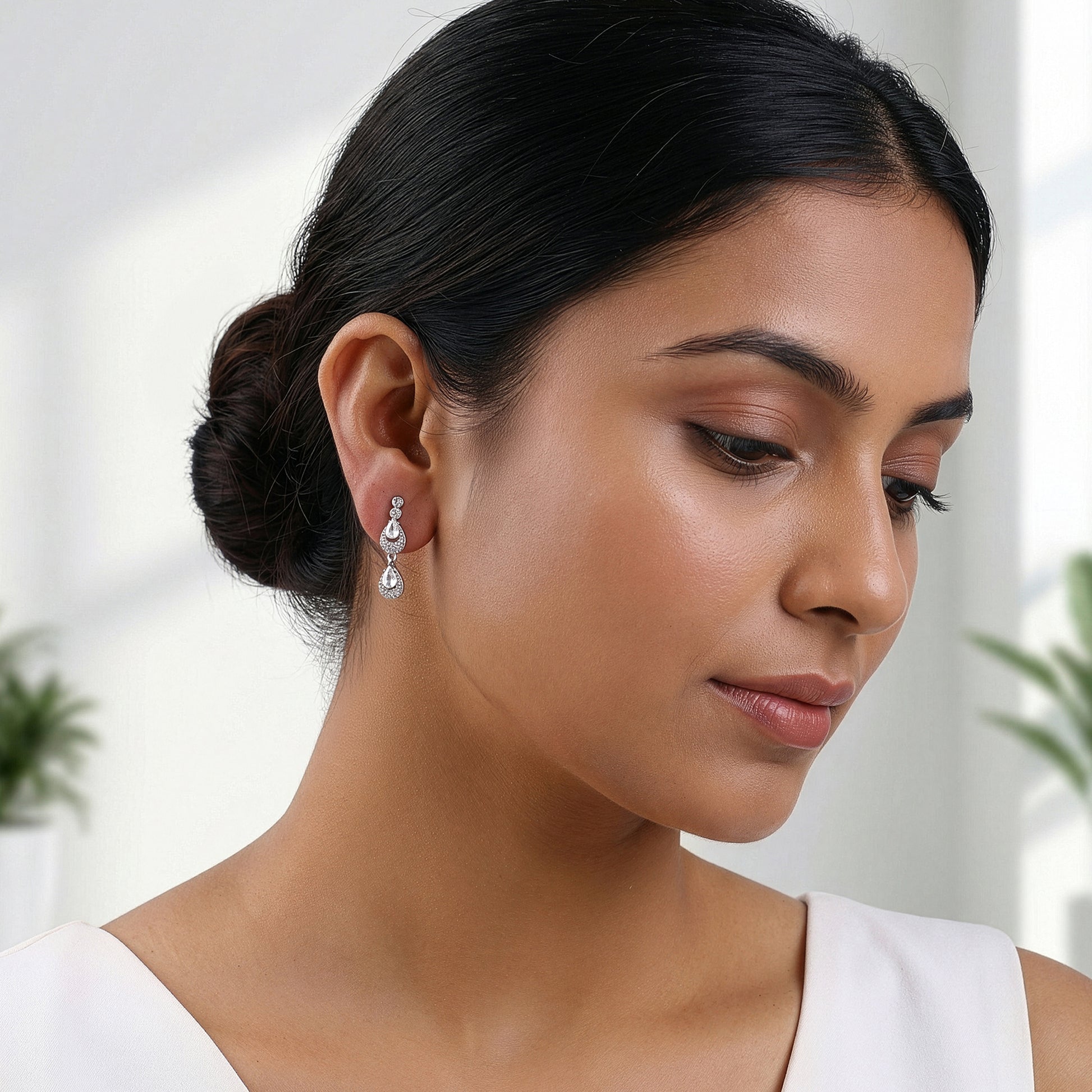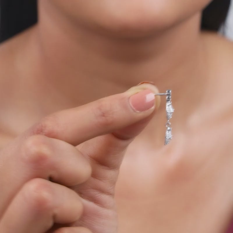 Inspired by royal gardens and heirloom vines, these silver earrings trace a path of zircon-set leaves toward a striking floral centre. The design flows into a triple pear-shaped drop, each set with zircons, creating a graceful silhouette with layered brilliance.