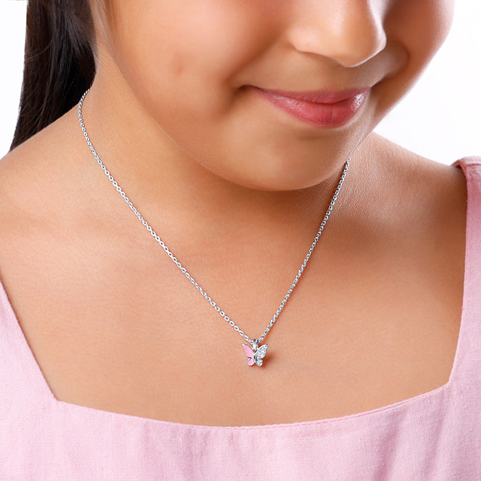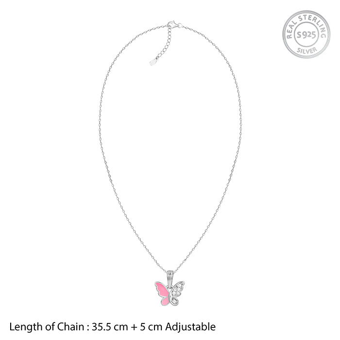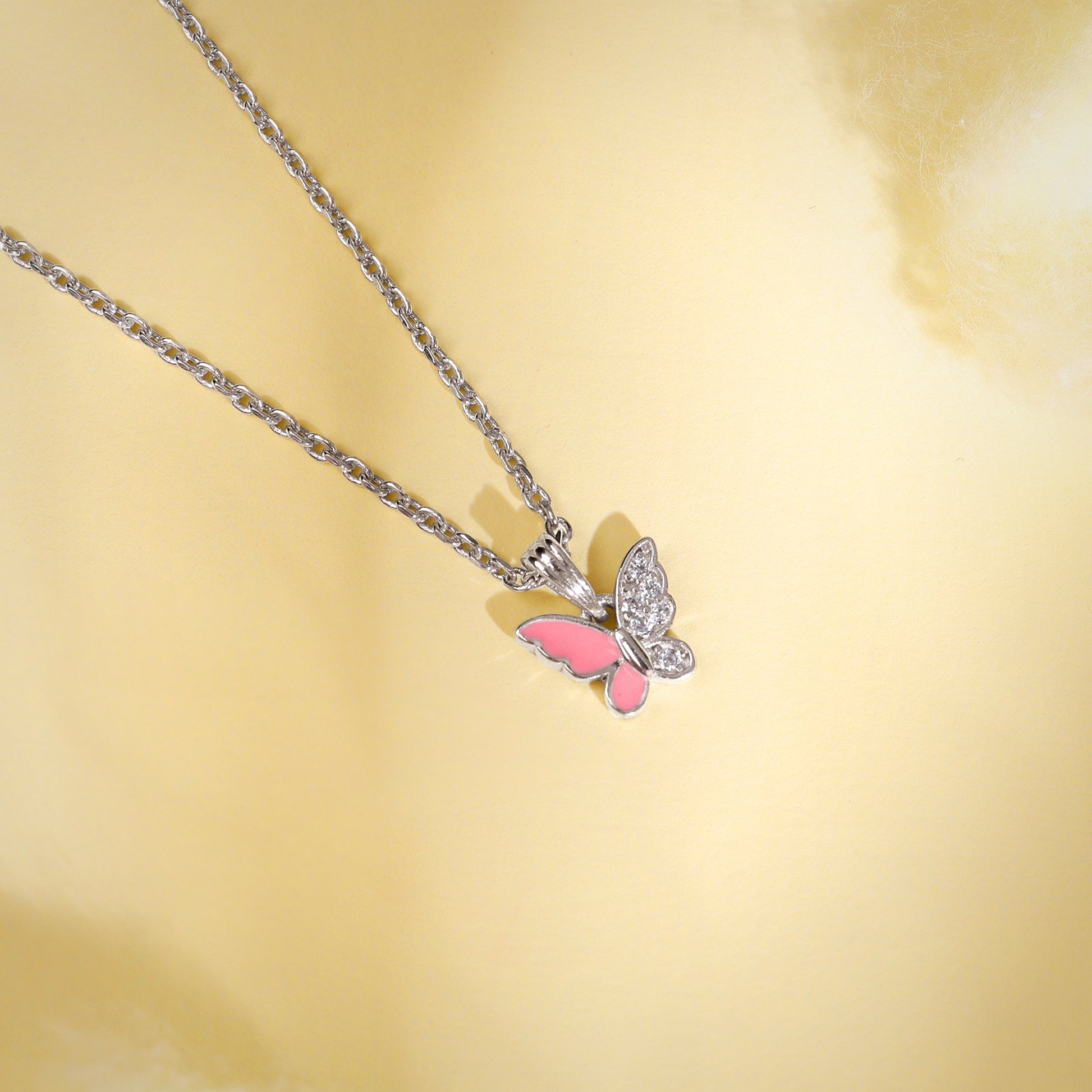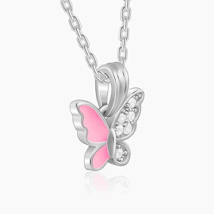 This silver kids pendant features a butterfly motif. One side of the wings is coated with pink enamel, and the other side is studded with zircons. It comes with a link chain.