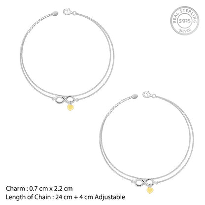 This silver anklet features an infinity design with a golden heart motif attached in one loop.