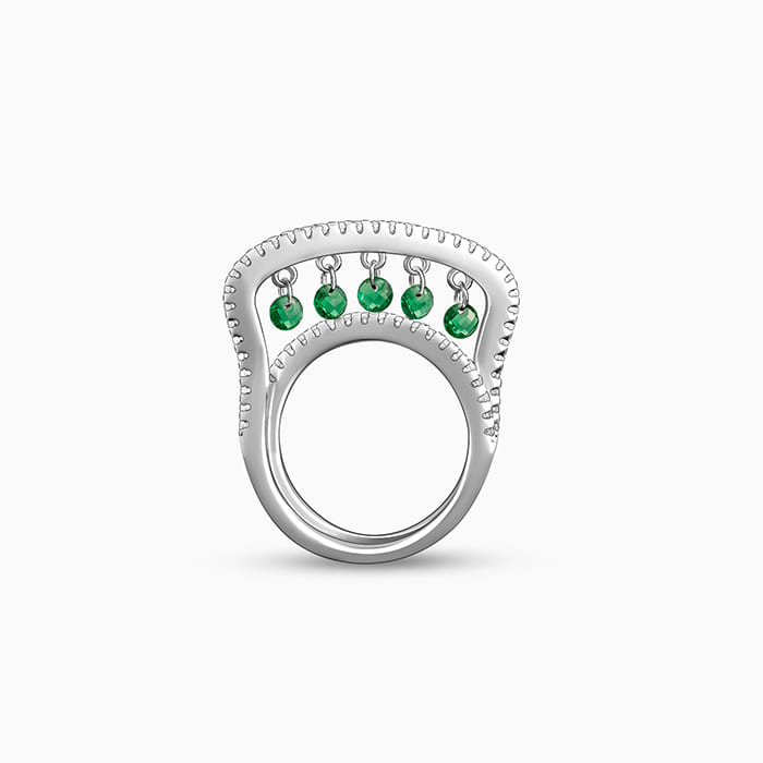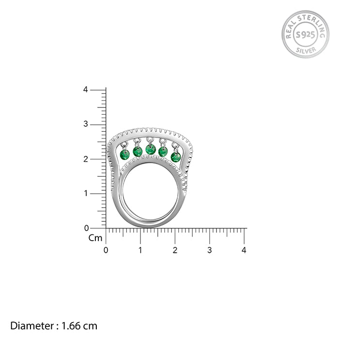 This silver ring features a curved design studded with zircons, with green-coloured charms dangling inside it.