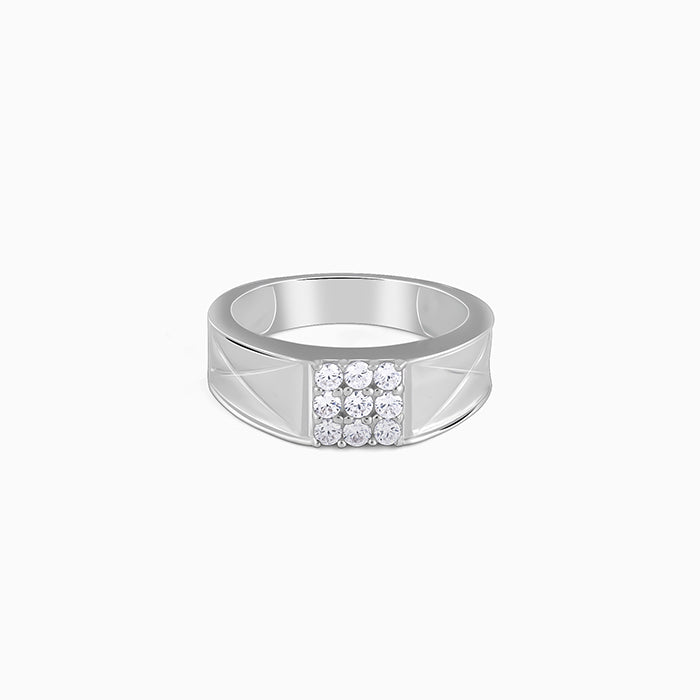 This silver mens ring features a square cluster of zircons at the centre, with a textured band.