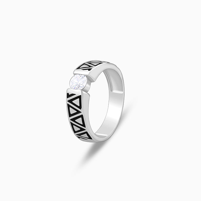 This silver mens ring features a round zircon at its centre. The band features a striking pattern of black enamel, arranged in triangular shapes.