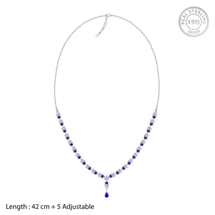 This silver necklace has a design of a row of flowers and every alternate flower is studded with blue stones.