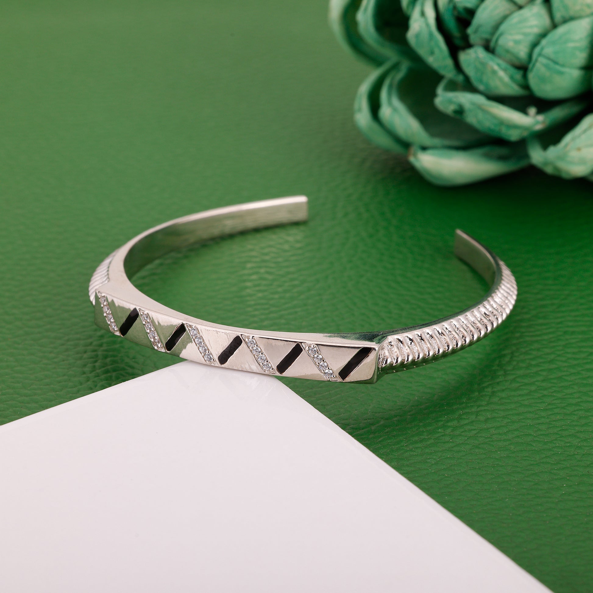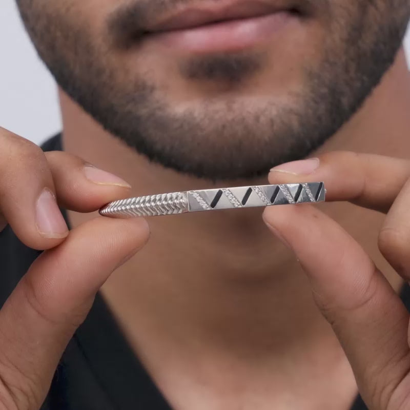 This silver bracelet has a beautiful zig-zag design in the centre studded with zircons, and a textured finish on the rest of the band.