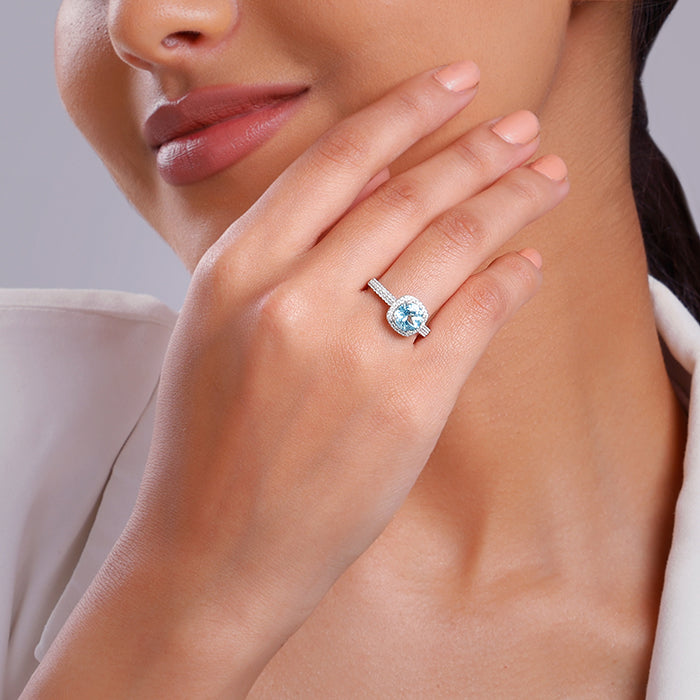 This silver womens ring features a natural circular-shaped blue topaz stone at the centre, surrounded by a square halo of zircons. The band is also set with zircons. From nature’s heart to yours - GIVA's natural Gemstone Collection makes every occasion special, whether you’re gifting a loved one or treating yourself.