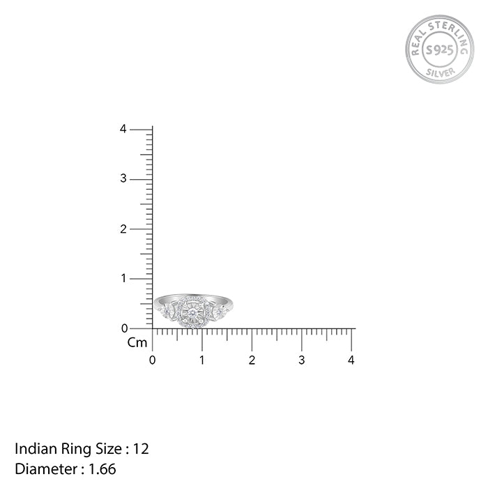 This silver ring for women showcases a central square halo design. A prominent zircon is placed at the centre of the halo and is surrounded by zircons. The ring also features two flower-like designs on either side of the halo. Each design in its centre, accented by zircon.