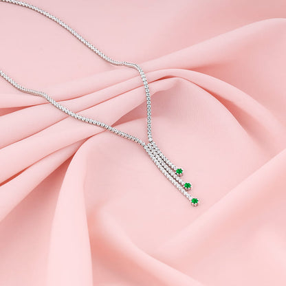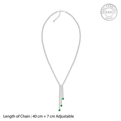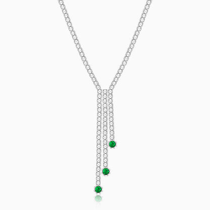 This silver necklace has a lariat design studded with zircons and three green coloured stones at the bottom.