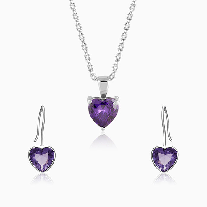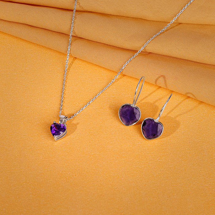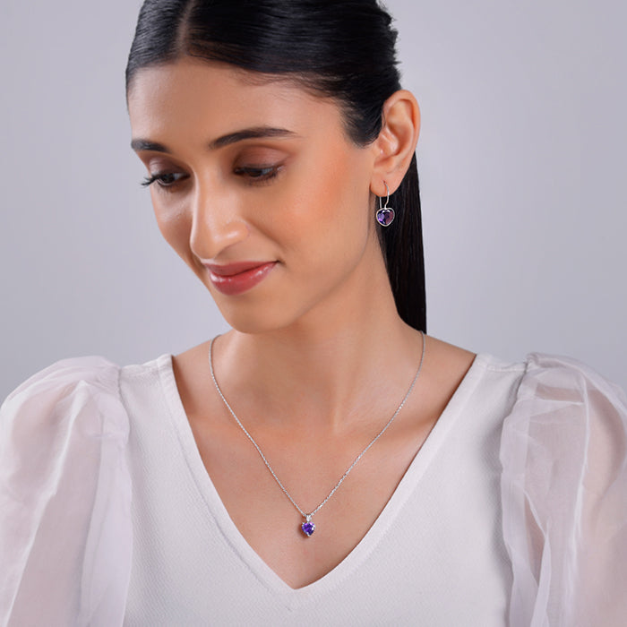 Feel the pulse of your style with this sparkling set that beats with charm! This set for women includes a pendant and earrings, each showcasing a heart-shaped design nestled with coloured zircon.