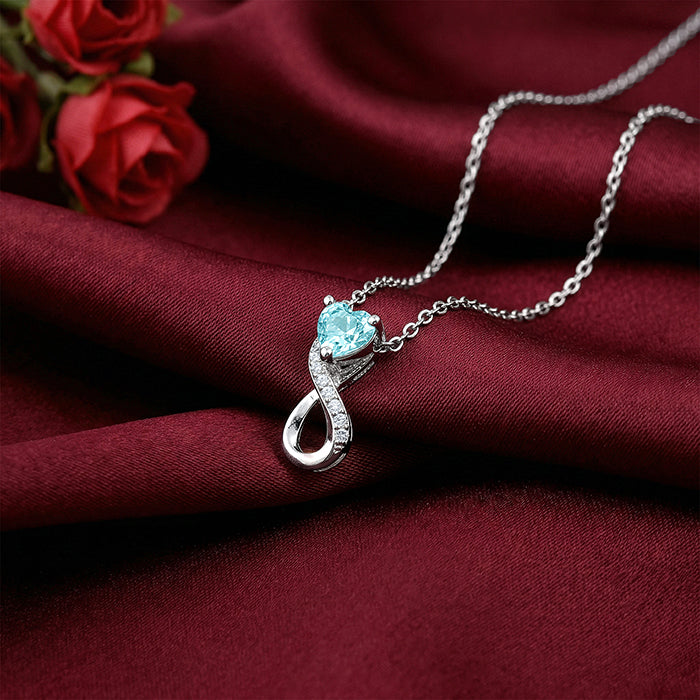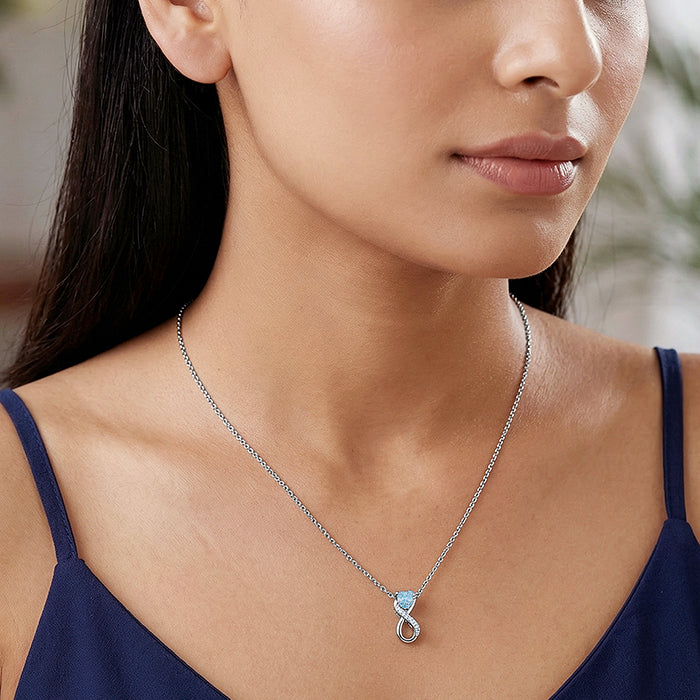 She believes in symbols that hold meaning. This silver necklace features a blue heart-shaped ice-cut stone set within an infinity sign, outlined with zircon accents that add quiet brilliance.