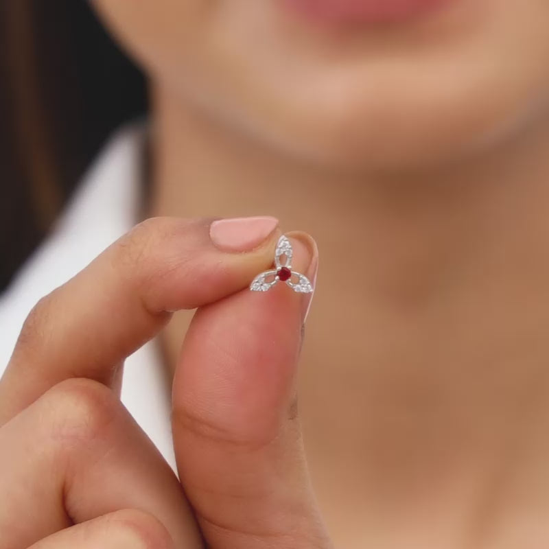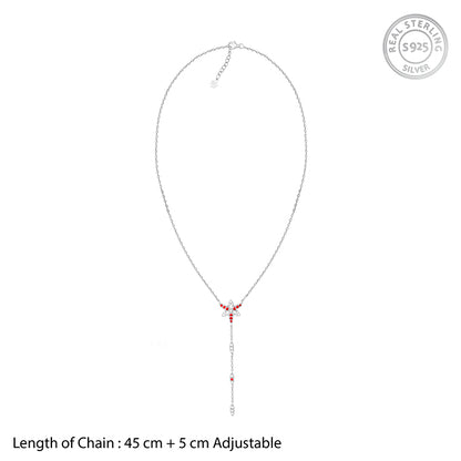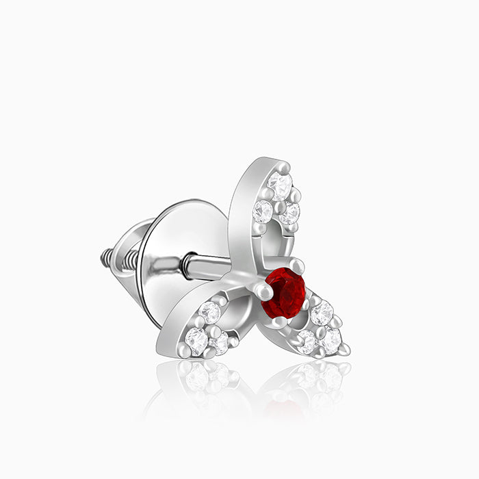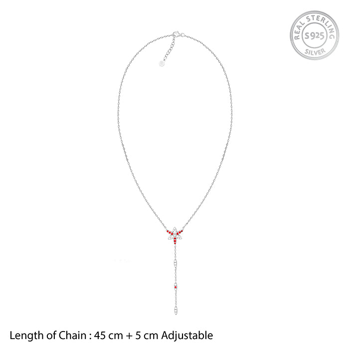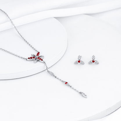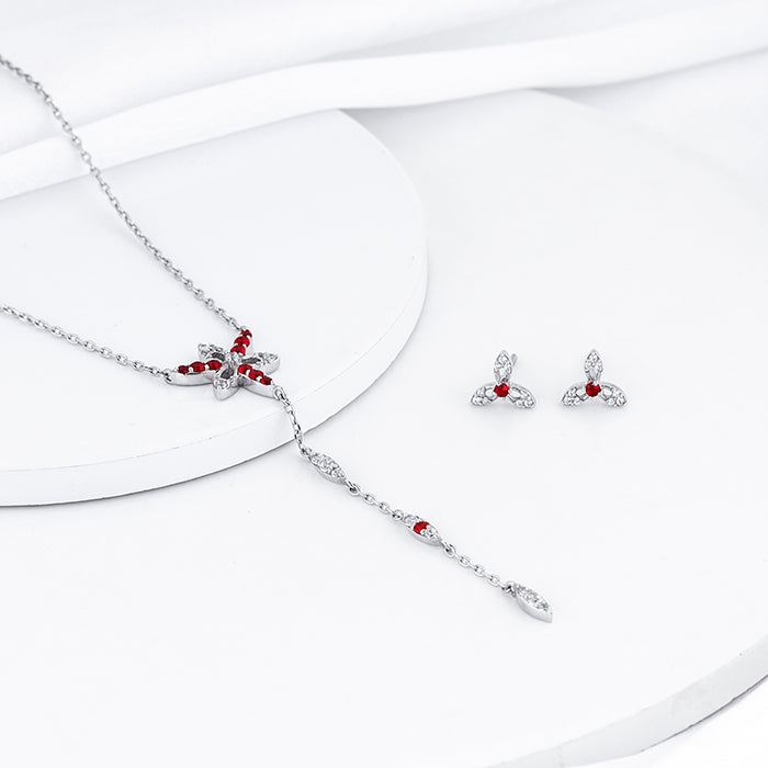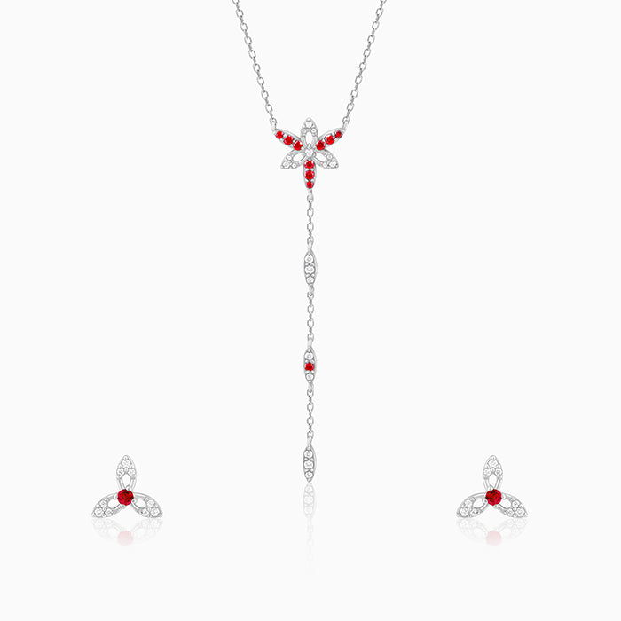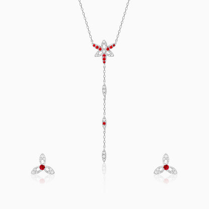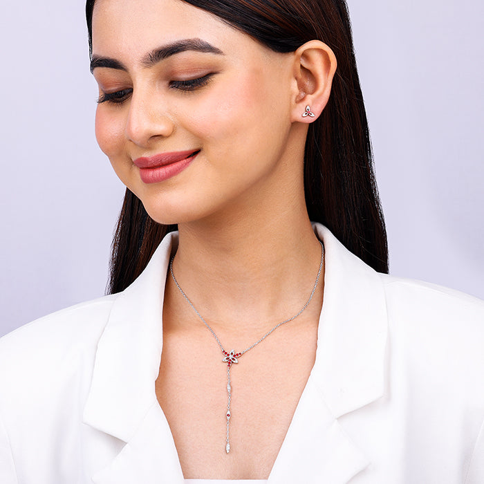 This silver set has a lariat type necklace features a zircon studded three petal motif juxtaposed with a three spokes studded with red stones and a pair of earrings set with zircons and red stones. Celebrate your moments of passion with GIVA’s Red Romance Collection.