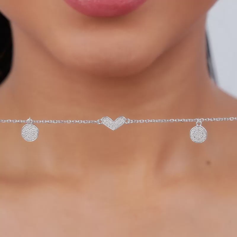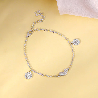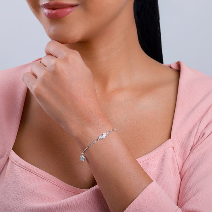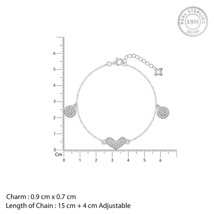 This silver bracelet for women features two circular motifs on each side, each studded with sparkling zircons. At the centre, a beautiful zircon heart design adds a touch of elegance.