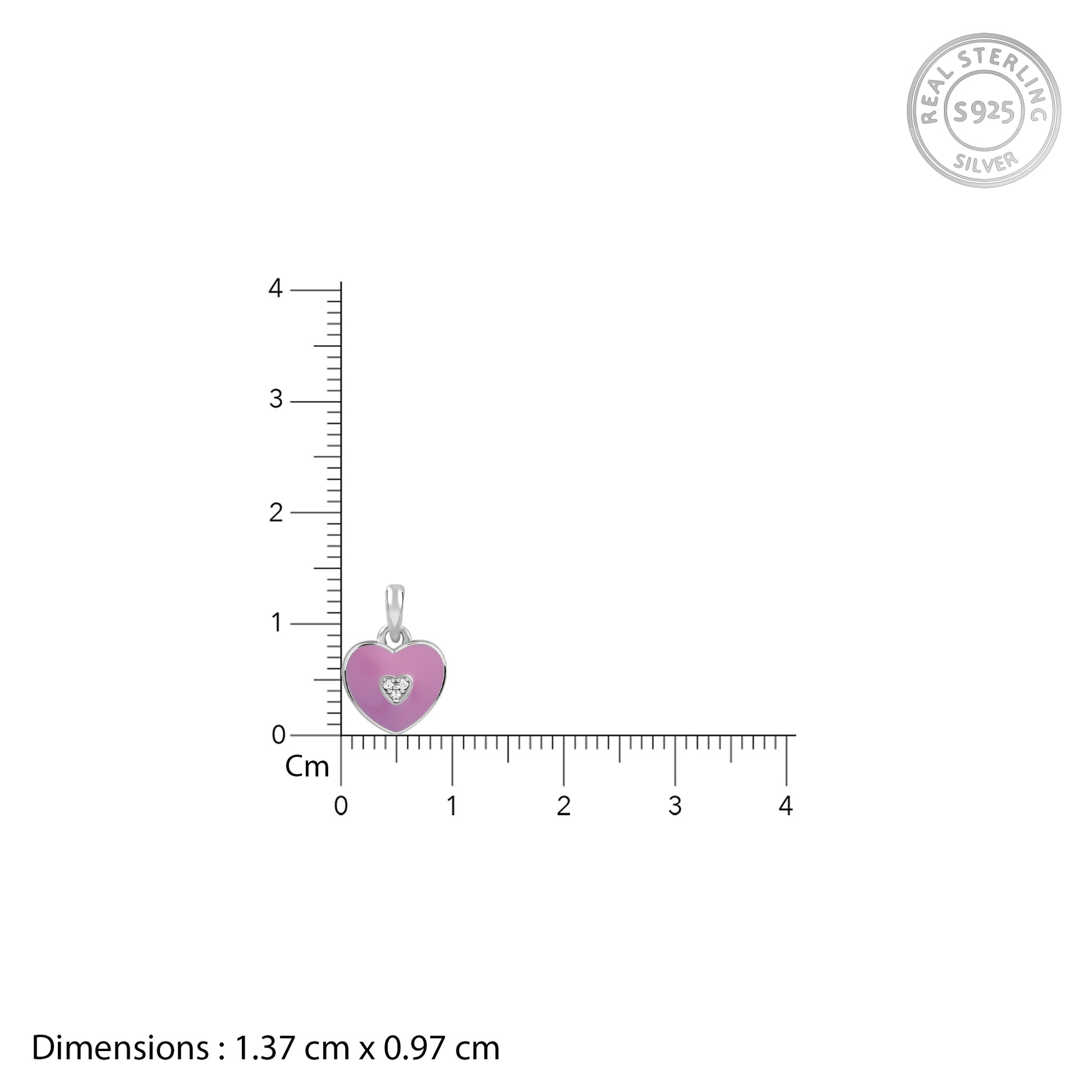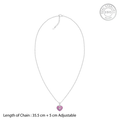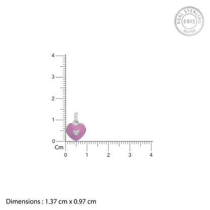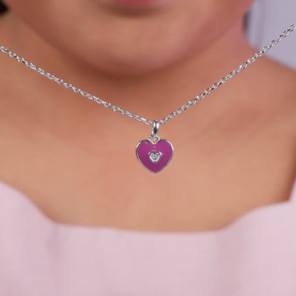 This silver pendant for kids features a heart motif. The heart is coated with plum colour enamel and studded with zircons at the centre. It comes with a silver link chain.