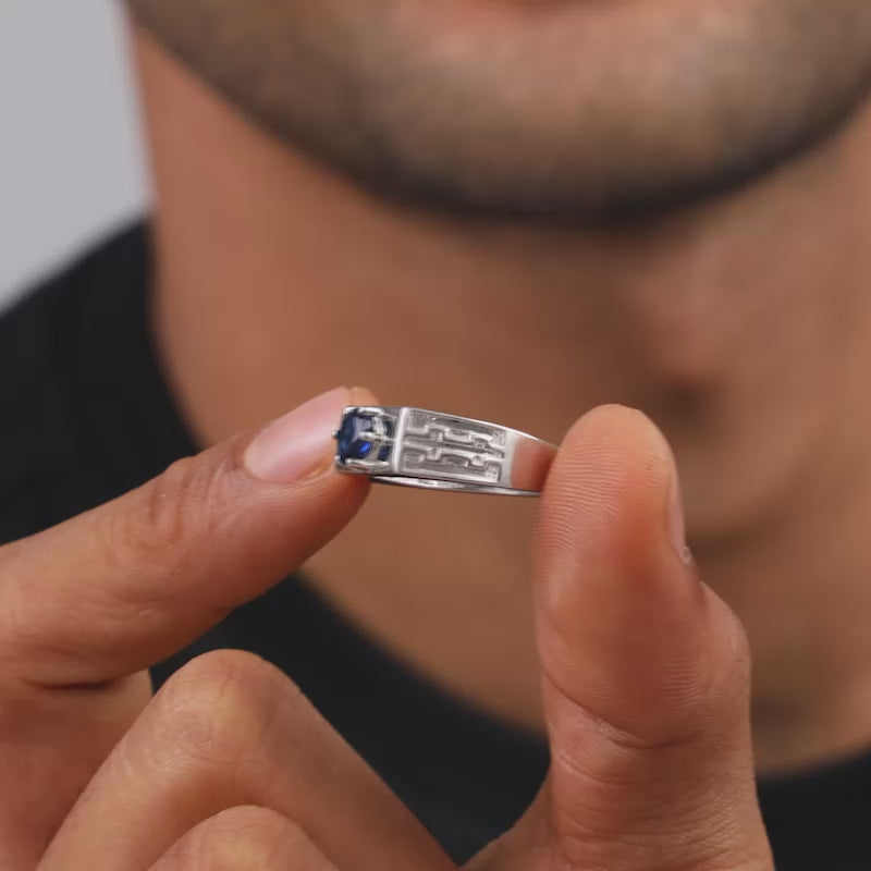 This silver mens ring features a striking deep blue stone set in a bold claw setting. With angular engravings along the band.