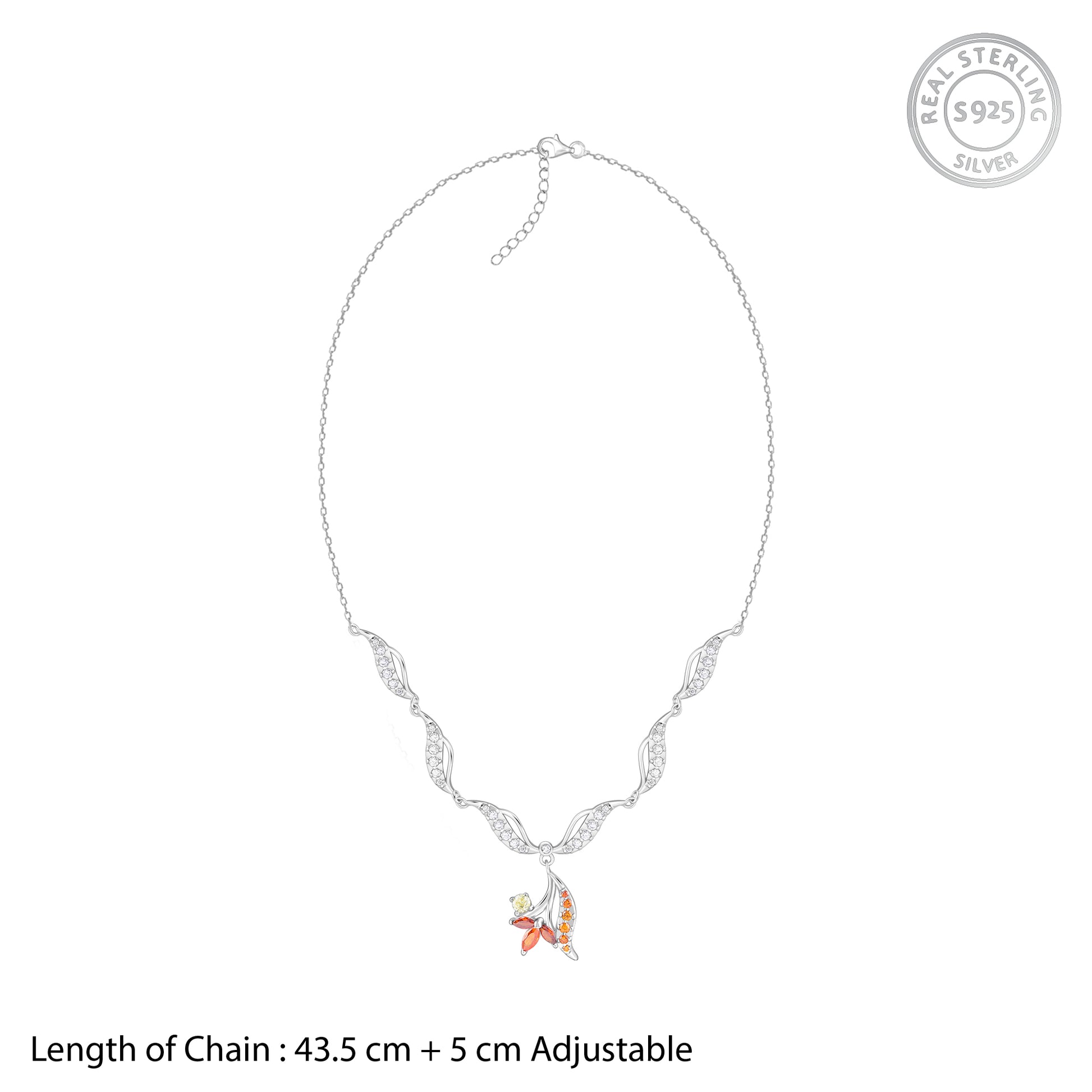 This silver set for women includes a necklace, ring and matching earrings. The necklace features a flower and leaf design, both studded with colourful zircons. The chain is further accented with zircon-studded leaf motifs. The earrings & ring mirror the flower and leaf design, also embellished with colourful zircons. Designed in Italy. Inspired by India. Embrace the goddess within with the Shakti Collection by GIVA x Anna Giulia Chicco.