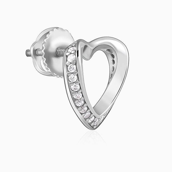 These silver earrings for women feature an open heart design. The heart is studded with zircon in pave setting.