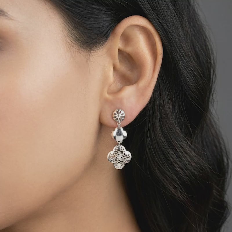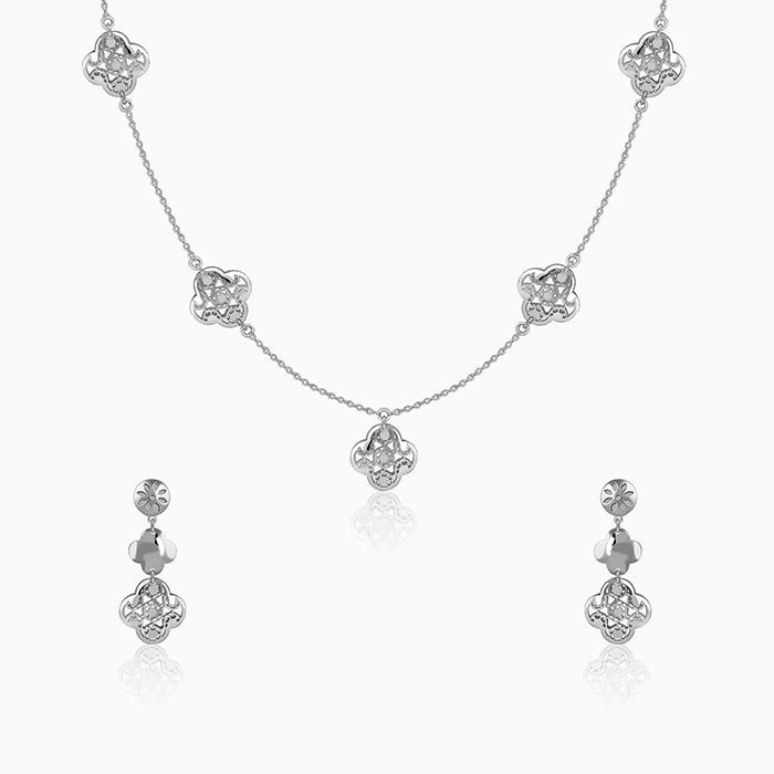 Inspired by blooming flowers and modern, sculptural metalwork artistry. This set jewellery for women features a silver necklace and matching earrings, each adorned with intricately crafted floral motifs. The openwork design blends organic petal shapes with a refined, contemporary geometric touch.