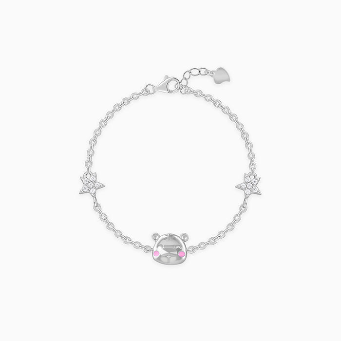 This silver bracelet for kids features a cute kitten design accented with enamel. Two star designs, set with zircons, are evenly spaced on either side.