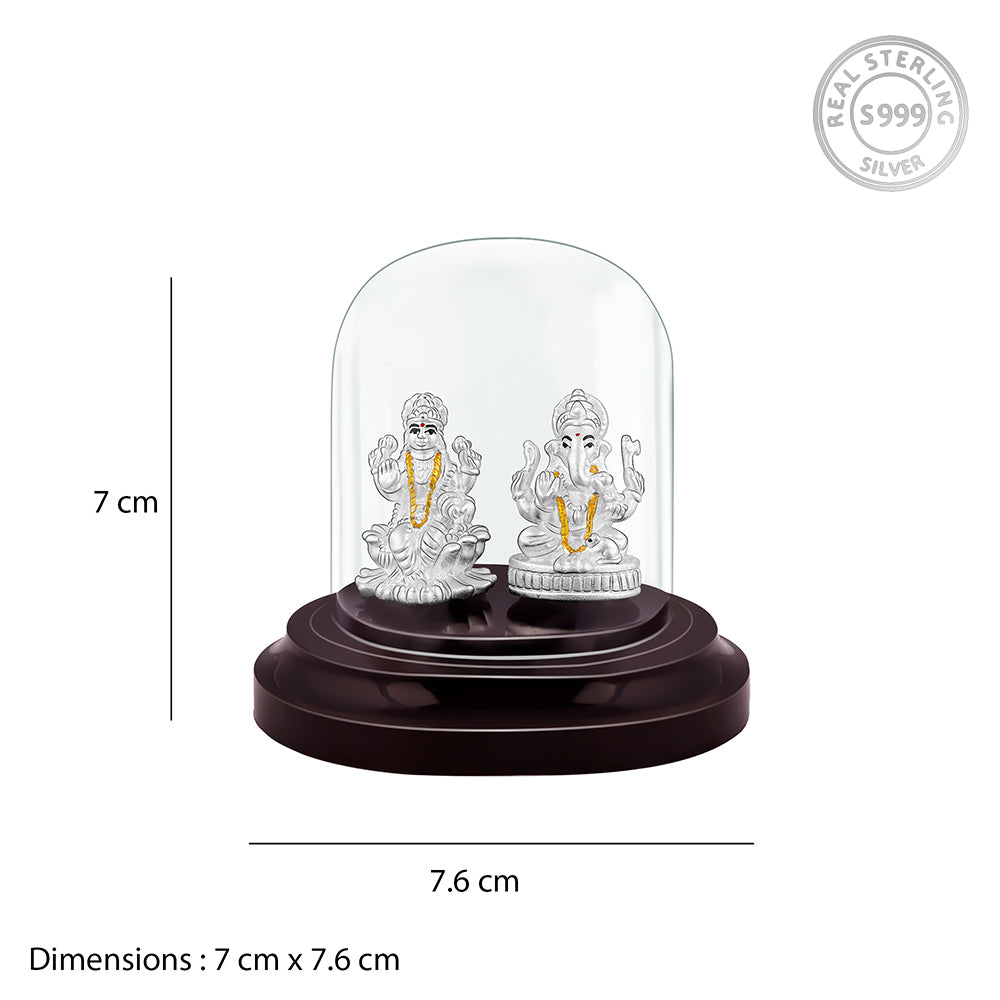 This silver Sri Lakshmi and Vinayaka idol is seated serenely with a vibrant yellow enamel garland adorning their necks. The duo is encased in a protective glass dome.