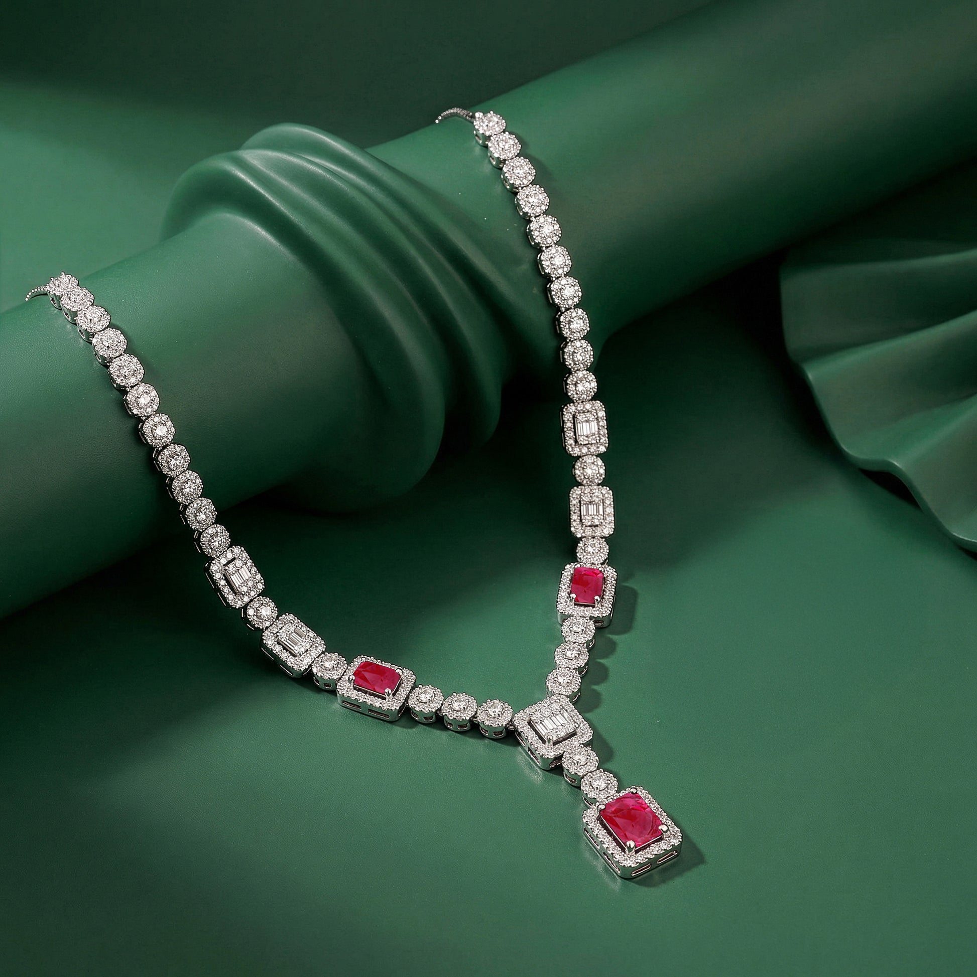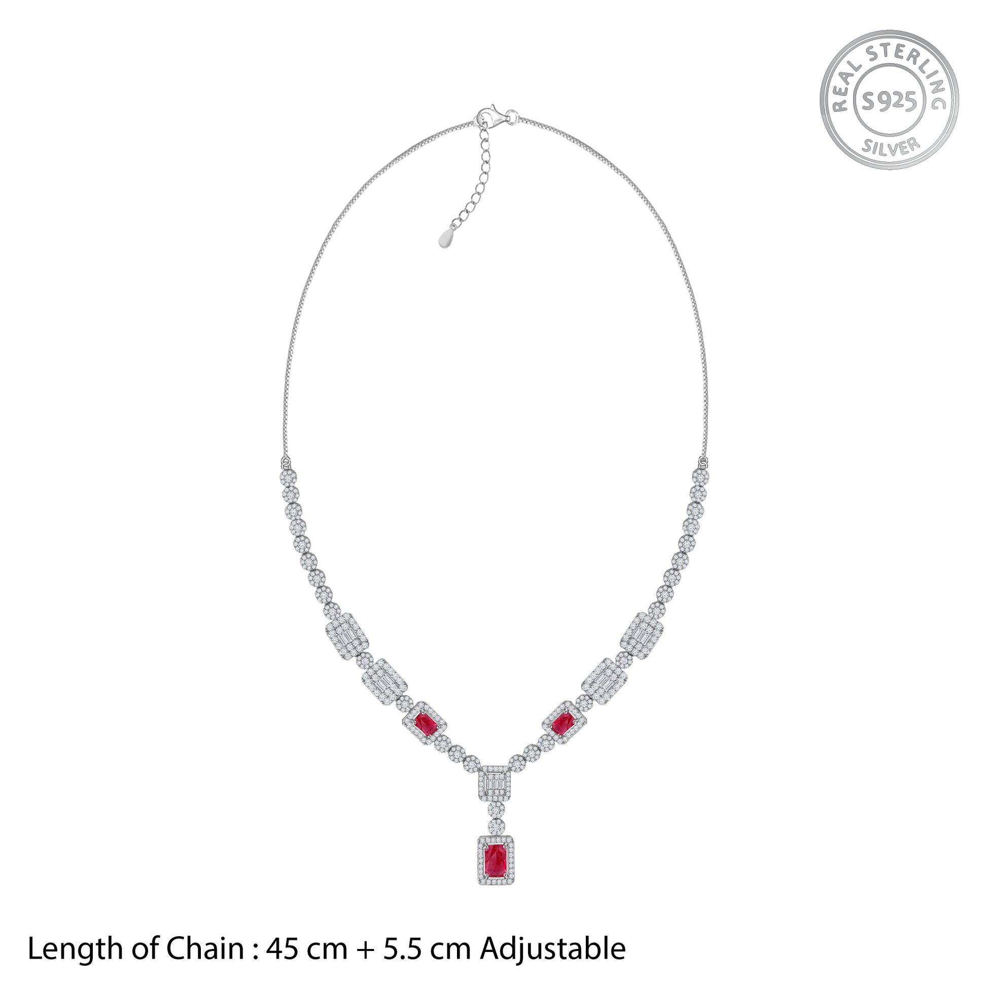 Inspired by regal insignias and ceremonial crests, this striking silver necklace celebrates symmetry and brilliance. Interlinked circles set with shimmering zircons frame princess cut red and white stones, creating a bold yet refined statement.
