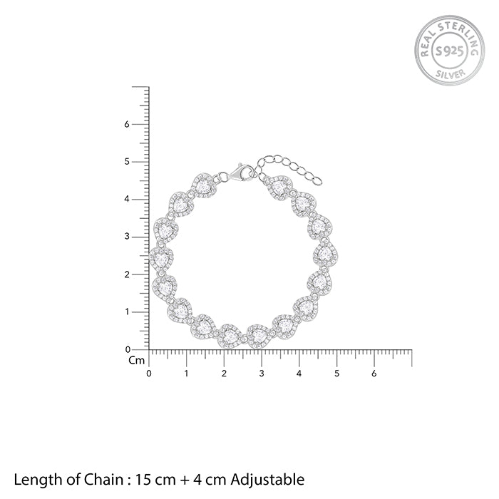 This silver bracelet for women features a continuous line of dual heart motifs. Each link showcases a central single zircon heart and an outer heart meticulously pave-set with zircons. Presenting our DIVA Collection - a limited edition silver jewellery meant for the women who own every room. Be the star of the party, always.