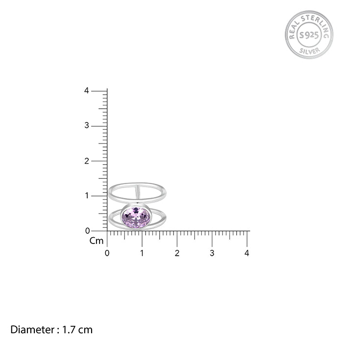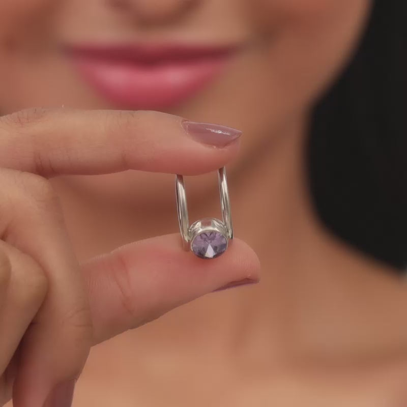 This special silver ring showcases a unique design, highlighted by a round pattern and a purple stone.