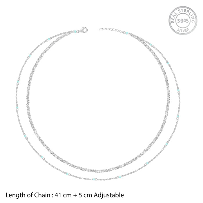 This necklace celebrates the beauty of layering, proving that two chains are always better than one for effortless style and texture. The design features a two-layer silver necklace: the top layer showcases a sleek, minimalist design, while the longer bottom layer is accented with evenly spaced enamel beads.
