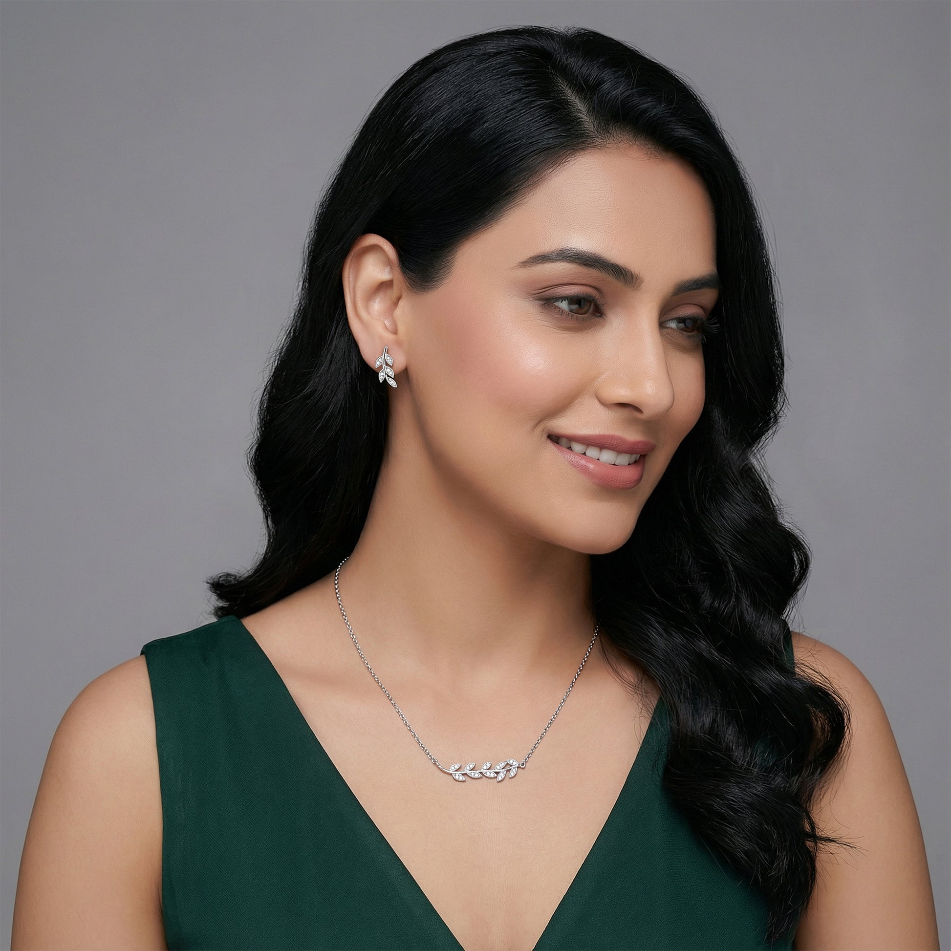 The Silver Leaf Set has a silver studded leaf pattern necklace and a pair of leaf earrings.