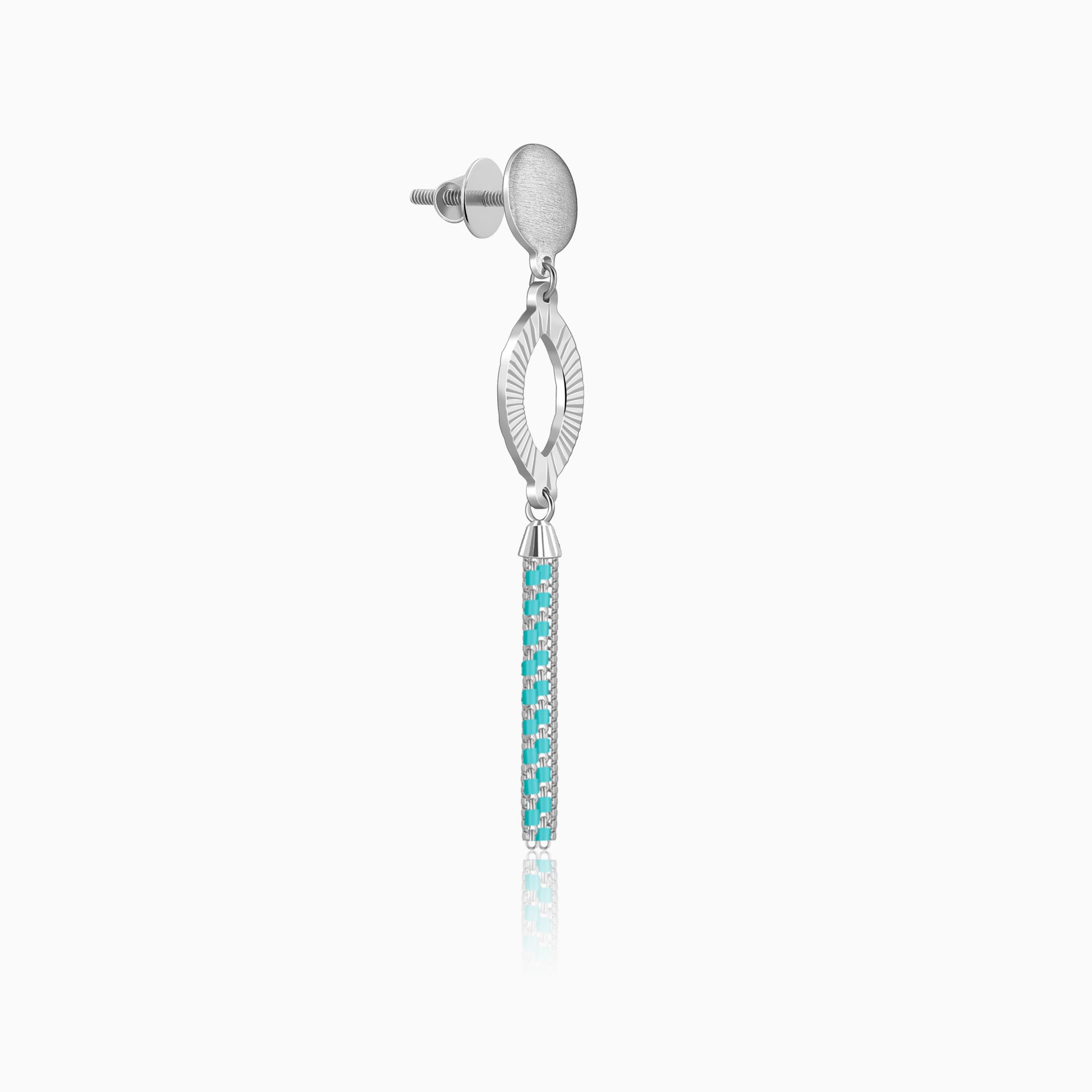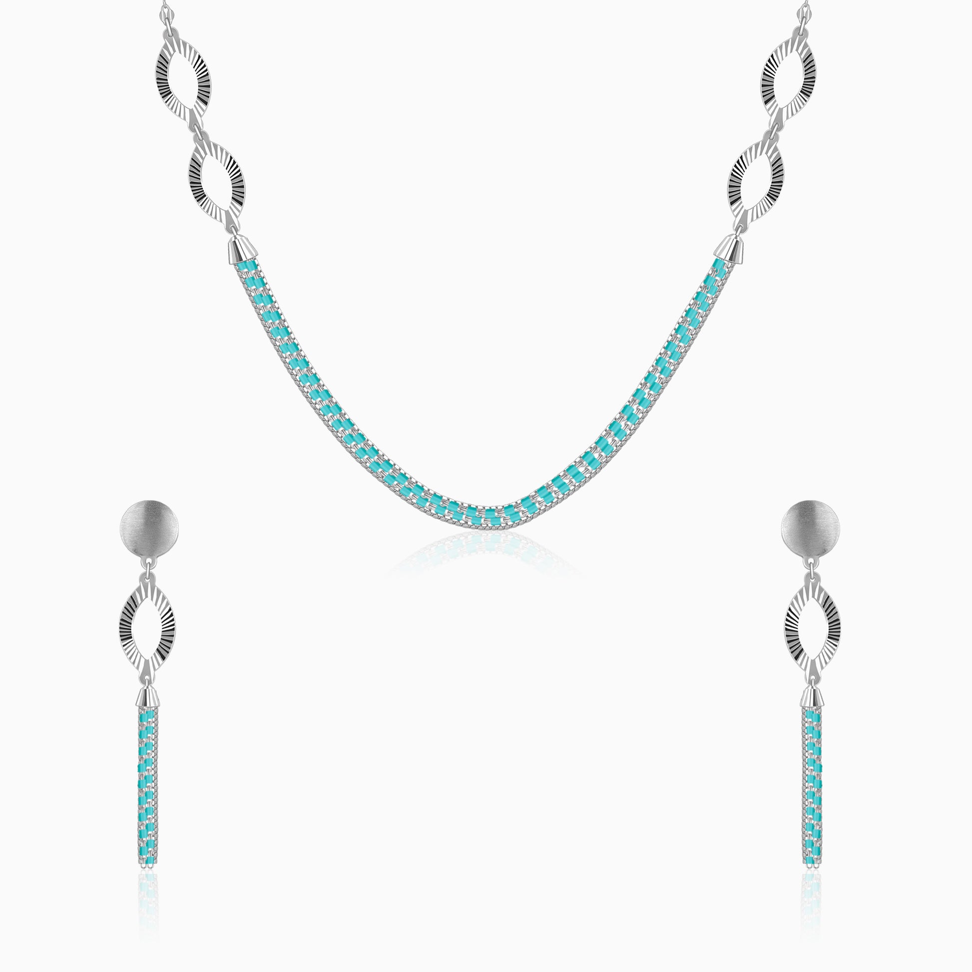 Make an unforgettable statement with this silver set for women, which includes a necklace and matching earrings, featuring a textured sunburst marquise frame that radiates refined charm. The design flows into a long, cascading tassel of box chains accented with vibrant turquoise beads made for the modern trendsetter. Barkha Singh x GIVA brings to you the Glow in Motion collection that celebrates CNC craftsmanship for the first time in silver.