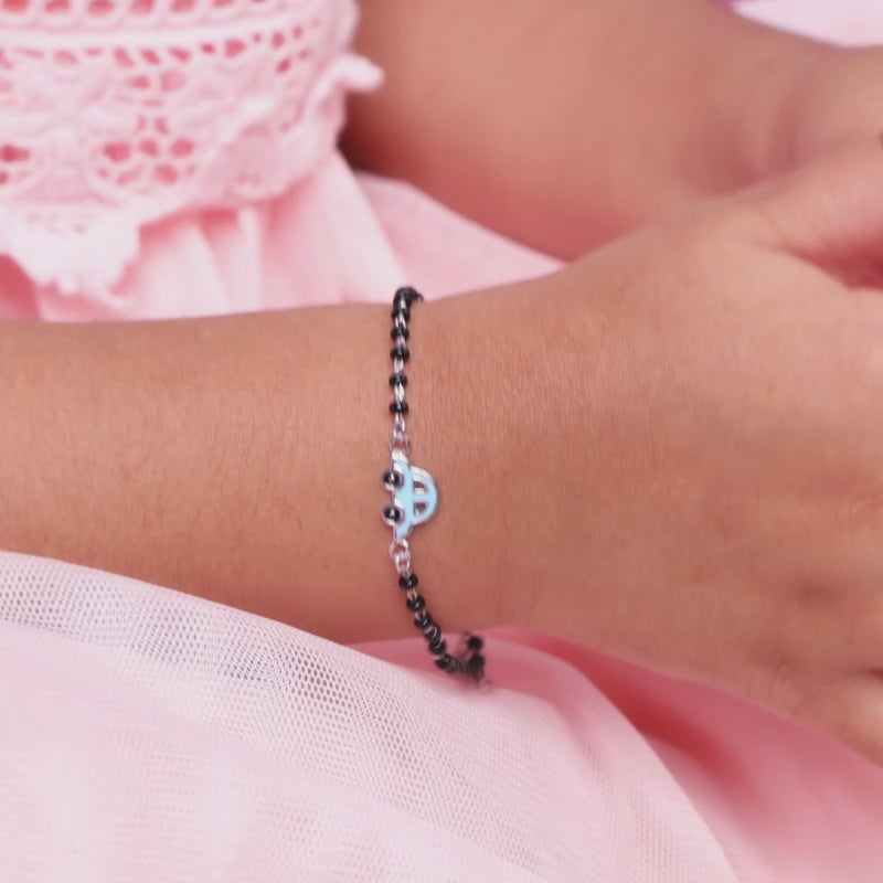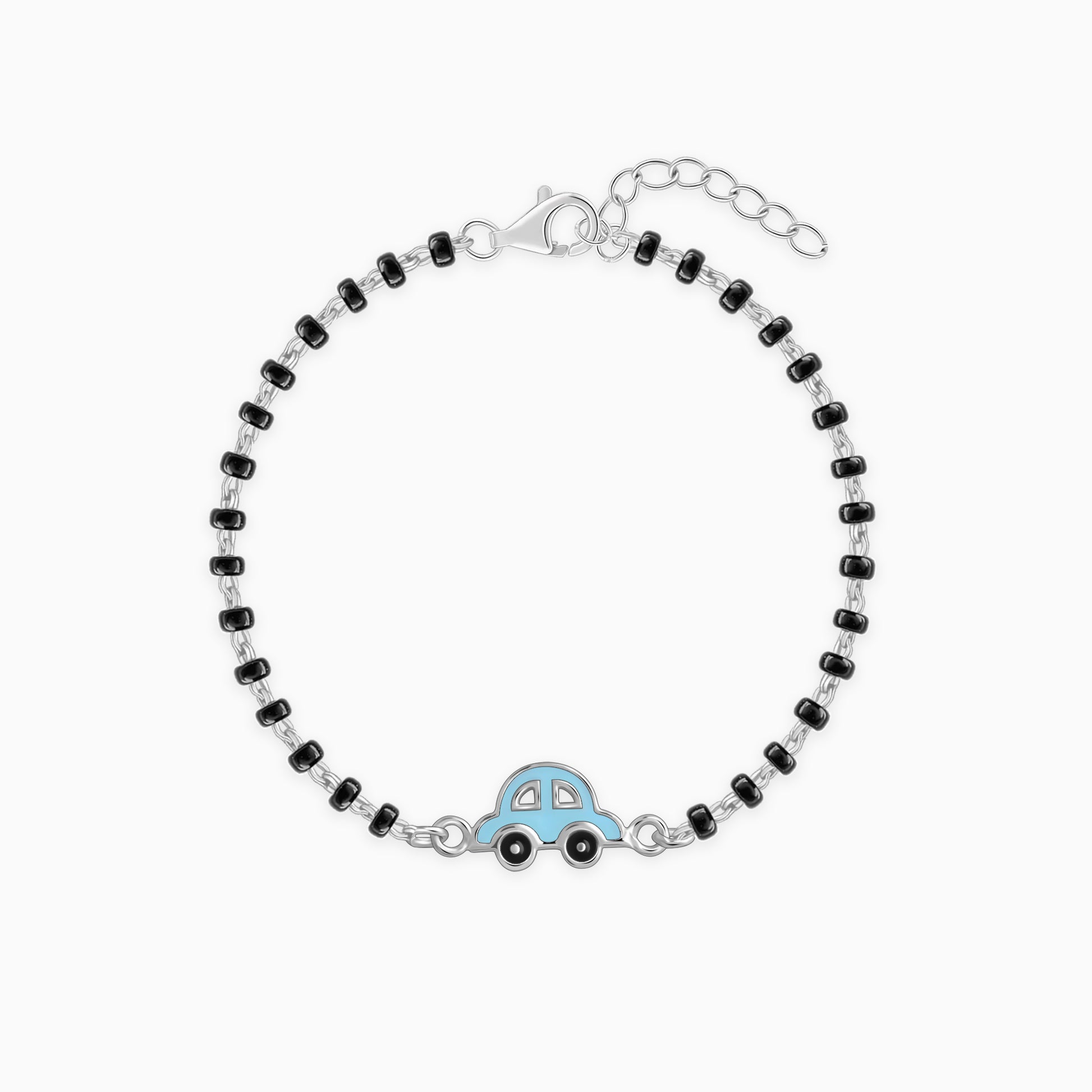 This silver kids bracelet features a car motif with blue and black enamel. It is paired with black beads on the chain.