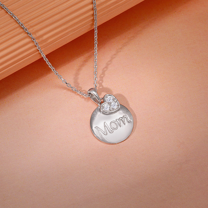 This silver pendant with link chain for women features a circular disc with the word "Mom" elegantly inscribed in a cursive font across the lower portion. Overlaying the top of the word "Mom" a heart shaped element entirely paved with sparkling zircons.