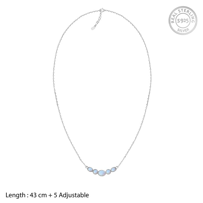 The Silver necklace has five moonstones arranged together as the charm on a silver linked chain.