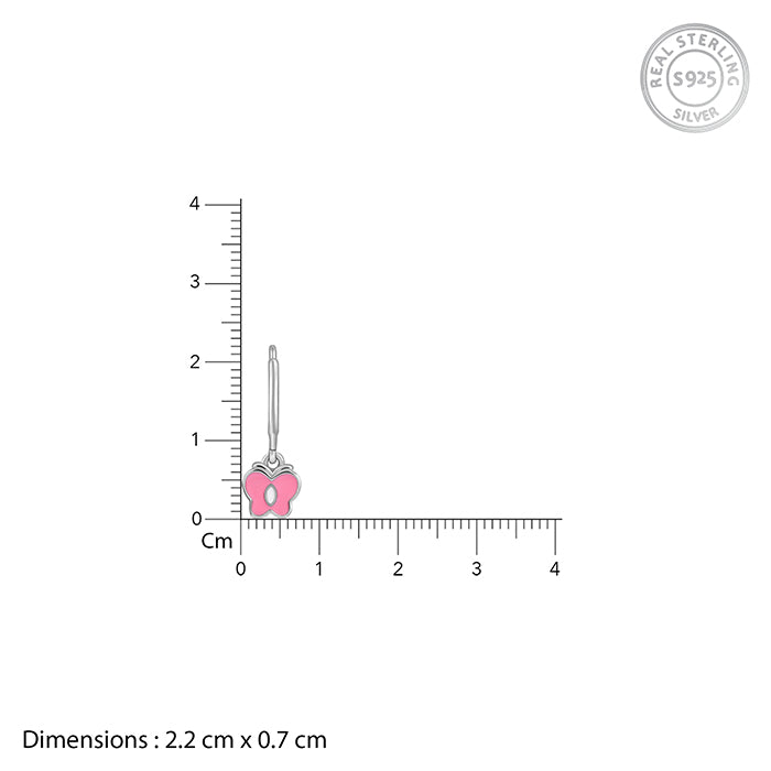These silver earrings for kids feature a cute dangling butterfly charm filled with coloured enamel.
