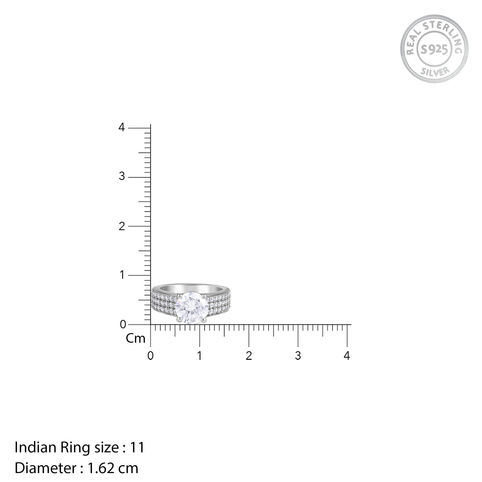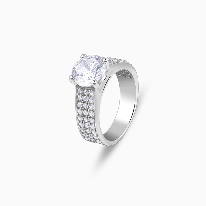 This silver ring for women features a flat band with three layers of zircons studded all over. A round cut zircon sits at the head, giving it a royal look.