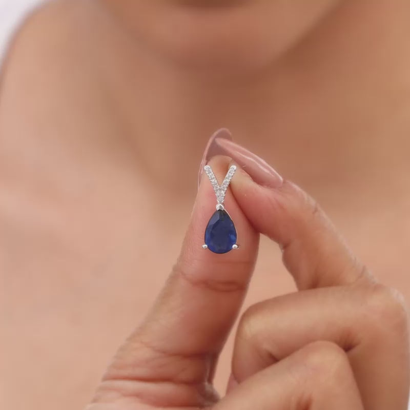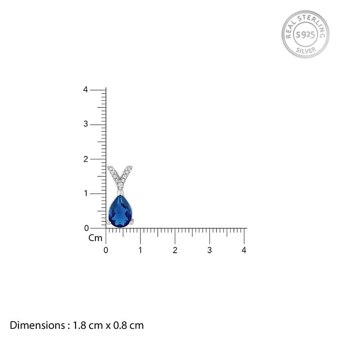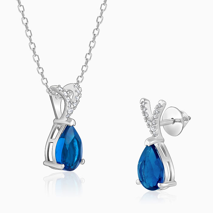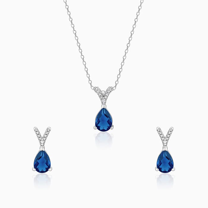 This silver set has a pair of earrings and a pendant with a link chain, featuring a blue coloured stone in a teardrop shape attached to a V-shaped motif studded with zircons.