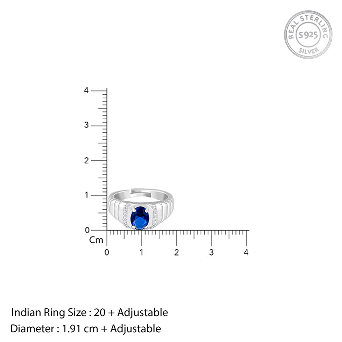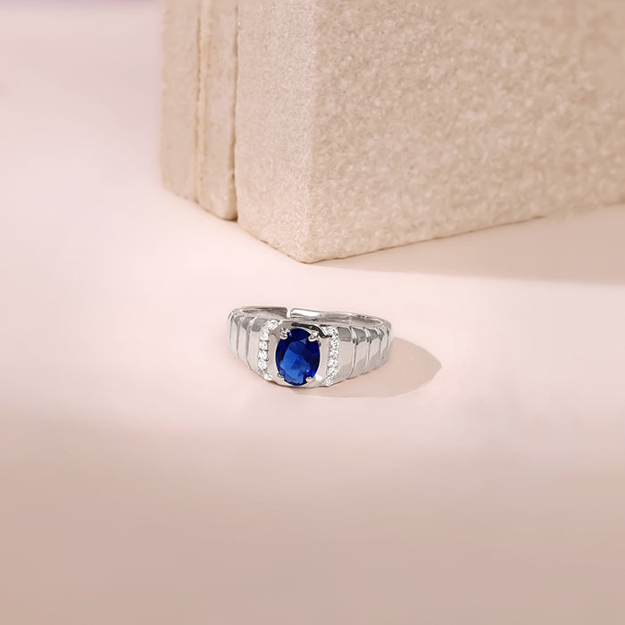 This silver mens ring features an oval-cut blue zircon at the centre. The centrepiece is flanked on both sides by sparkling zircon. A textured band completes the design.