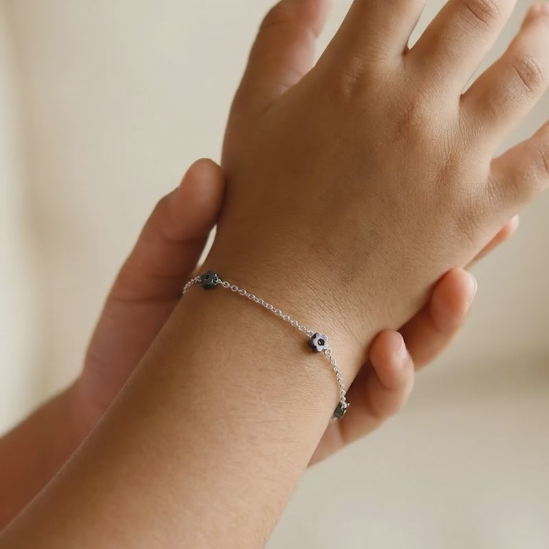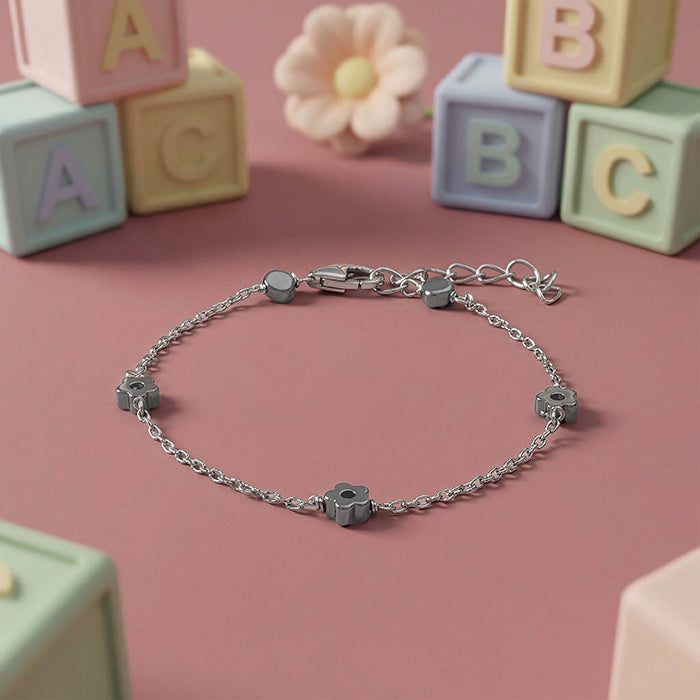 A cheerful silver bracelet for kids, featuring a floral motif framed by playful beads. A sweet blend of bloom and shine, made for bright little moments.