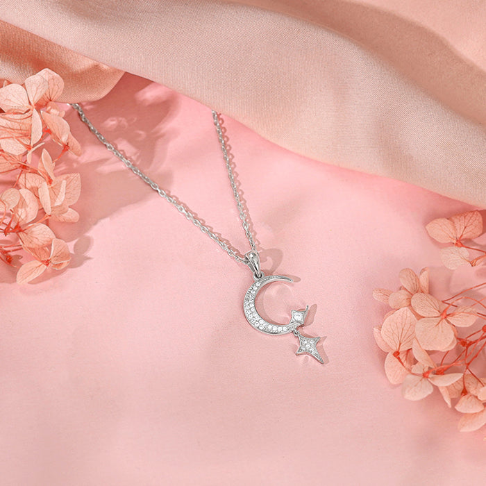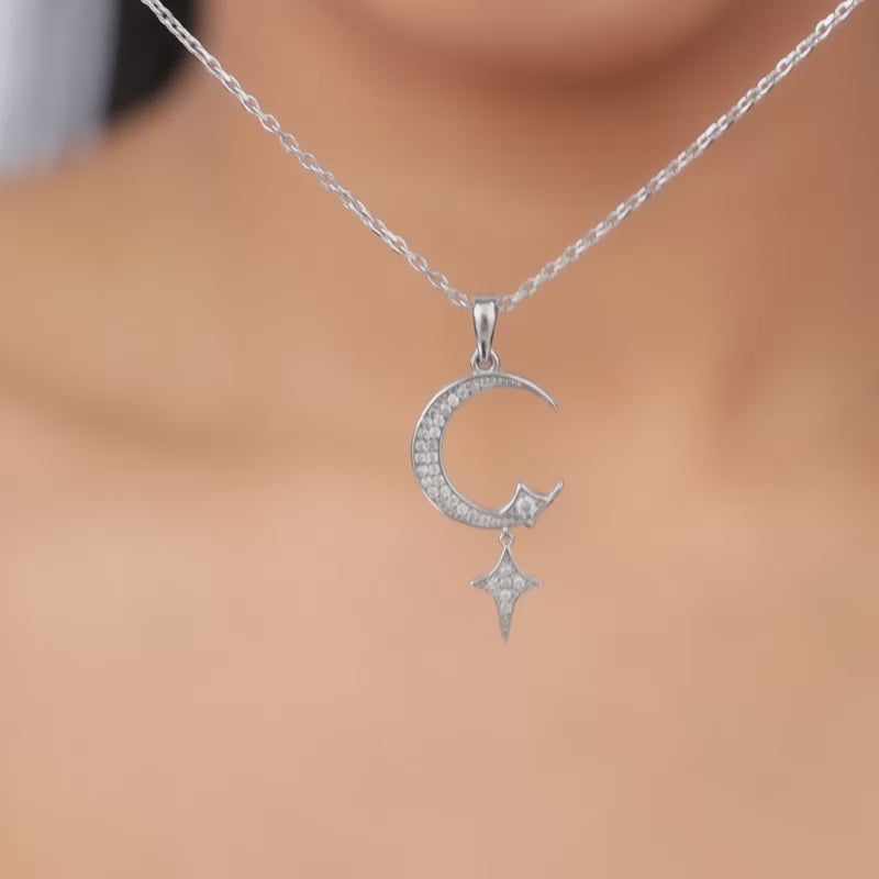 This silver pendant with a link chain for women features a crescent moon with zircons, elegantly complemented by a dangling zircon-studded star.