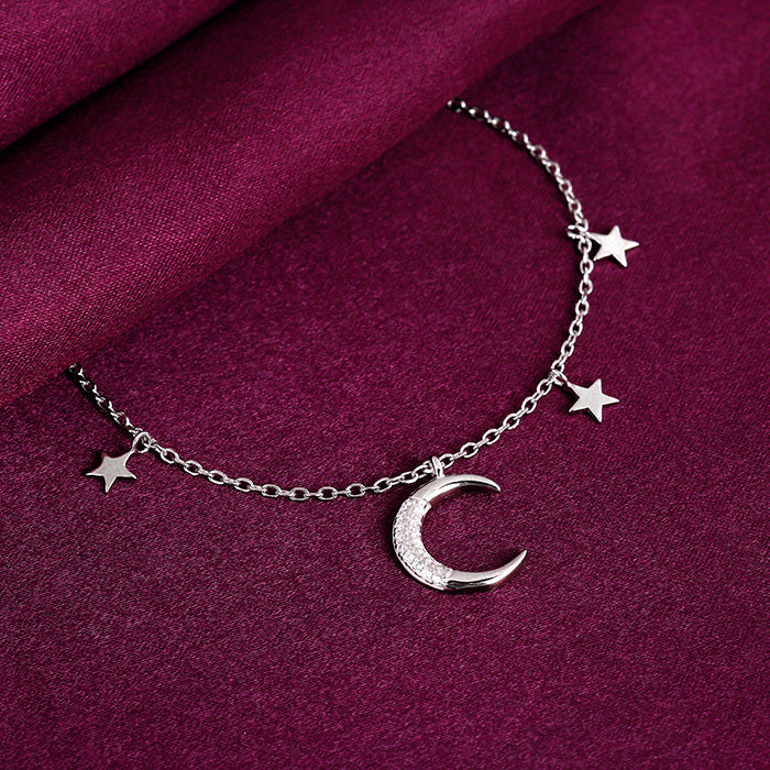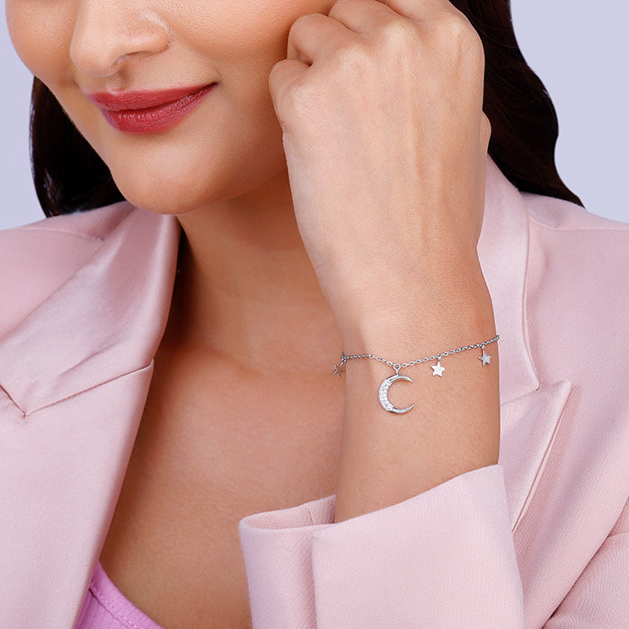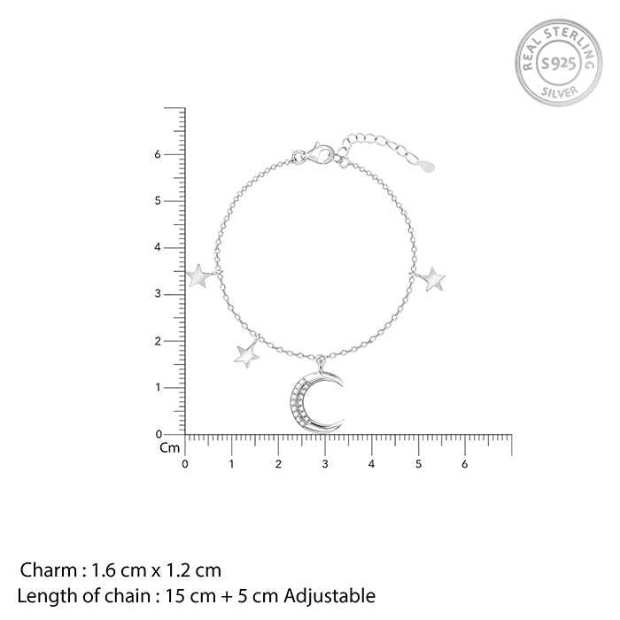 This silver bracelet has a moon motif studded with zircon at the centre with two stars to its left and one star to its right.