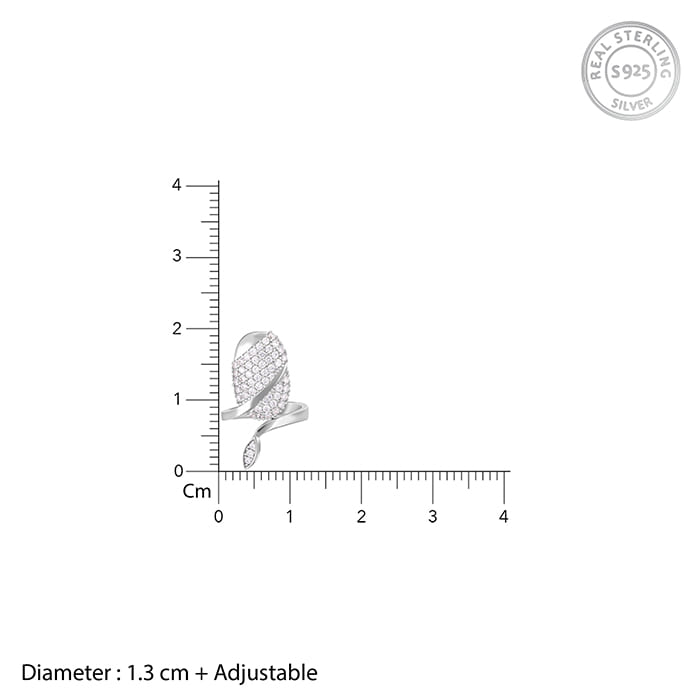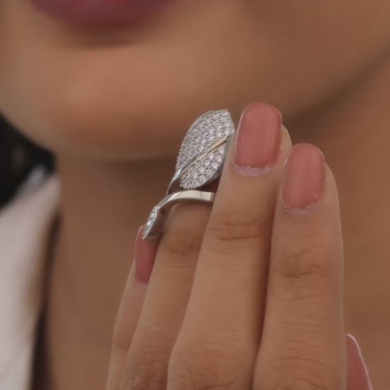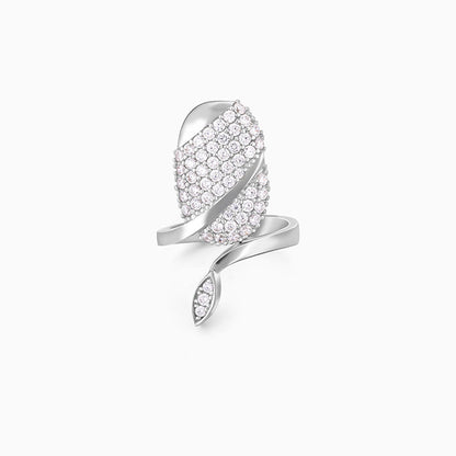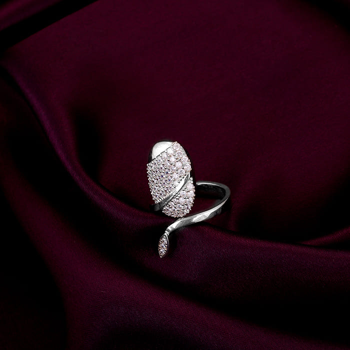 This silver ring has a nail-shaped motif studded with zircons with a sleek snake wrapped around it.