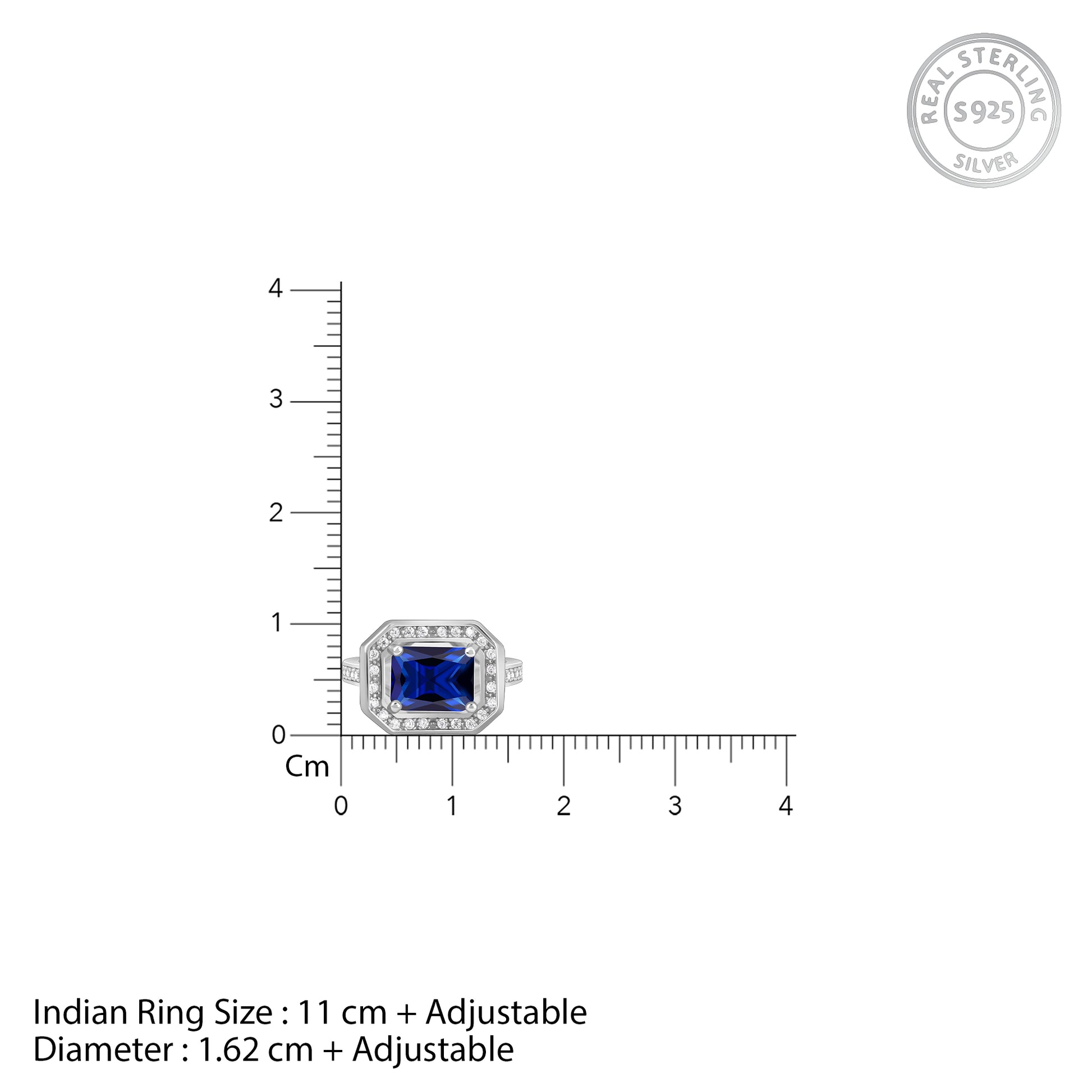This silver ring for women features a sleek rectangular design, highlighted by a central blue-coloured stone and surrounded by shimmering zircons.