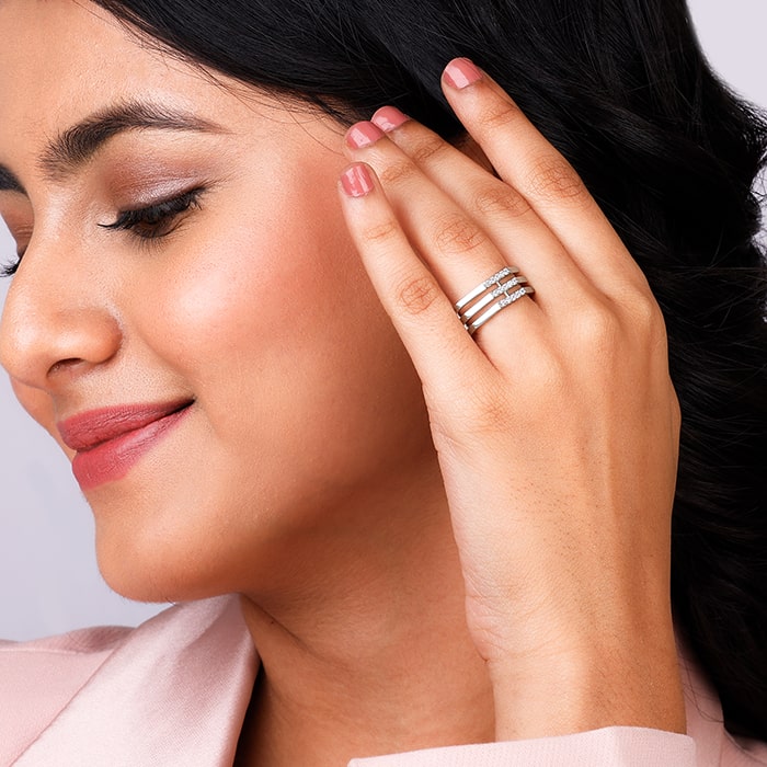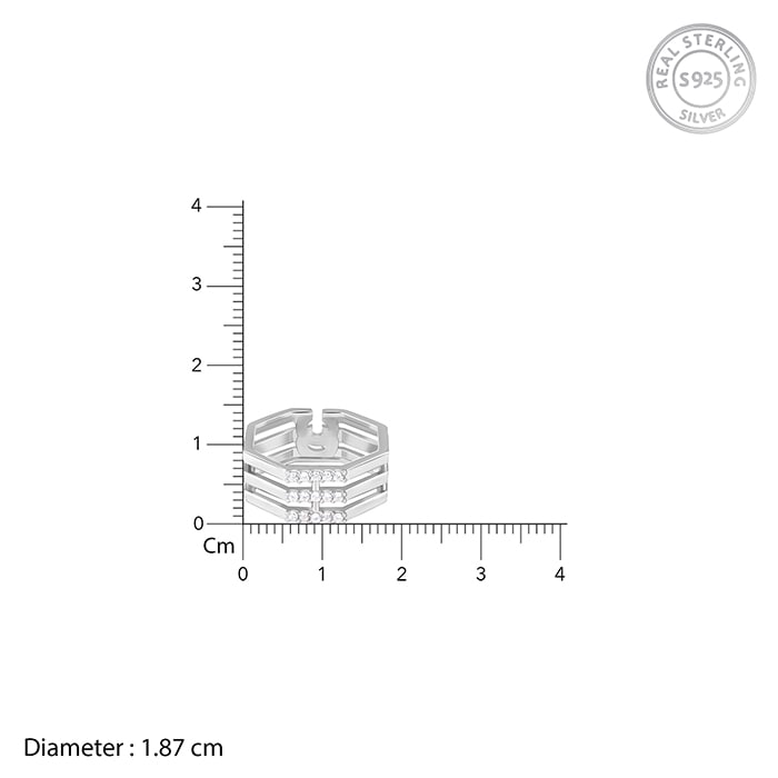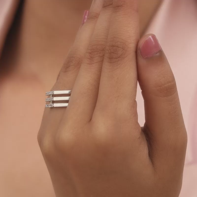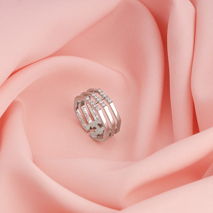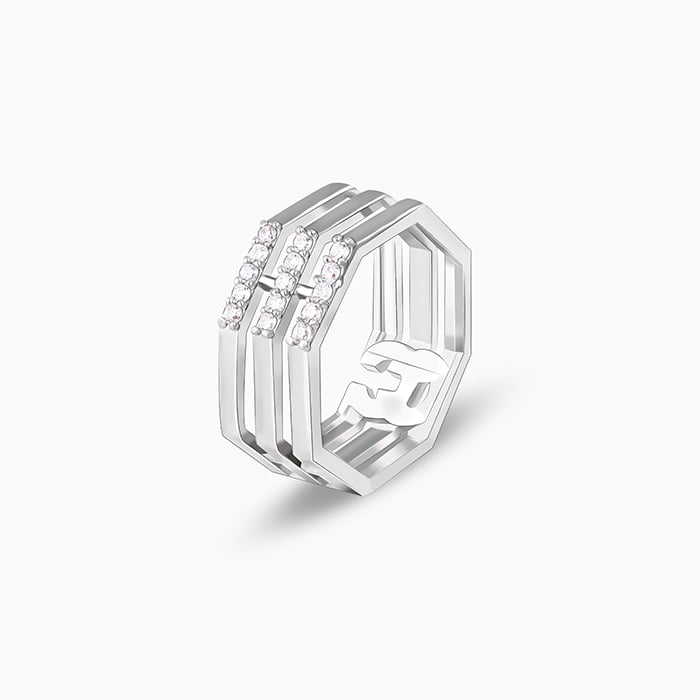 This silver ring has a unique octagonal shape all around and features three thin stacked bands studded with zircons in the centre of each.